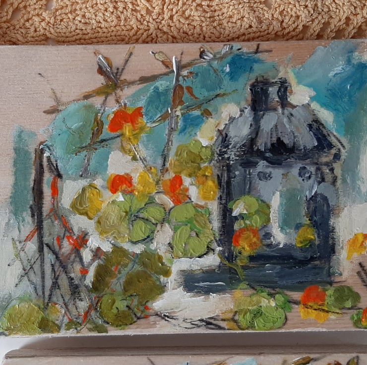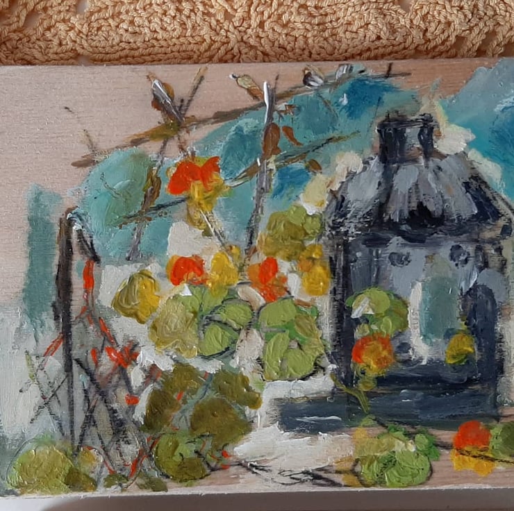 This small painting on reclaimed wooden by artist hestasinglewood is full of the feel of a Sunday down the plot