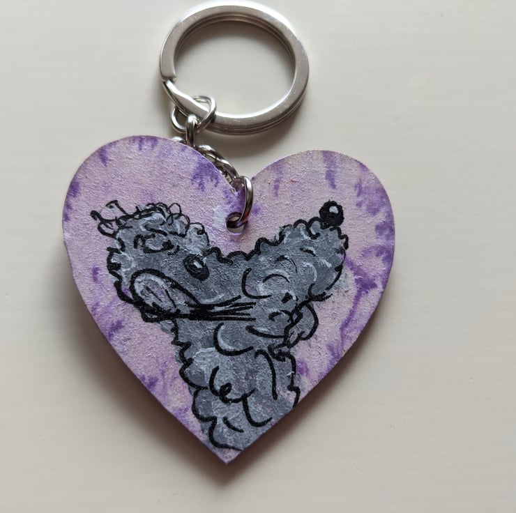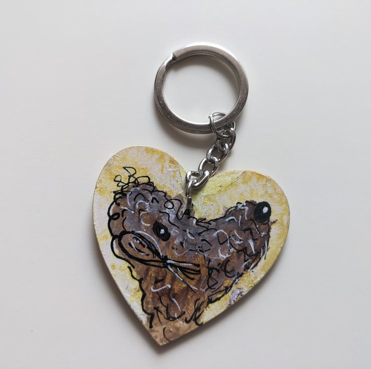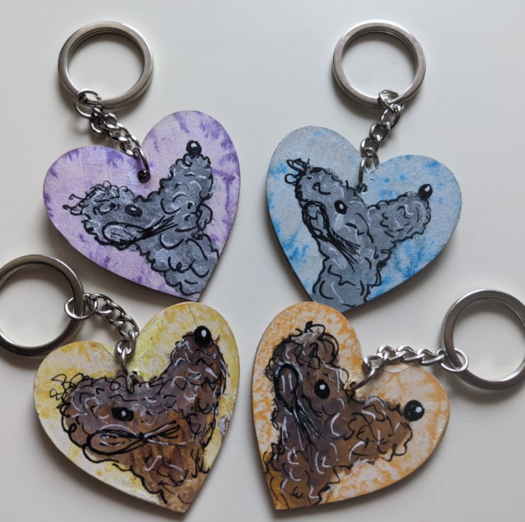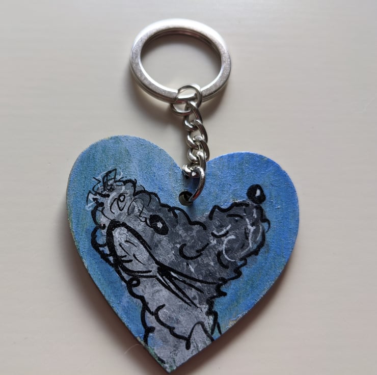 A heart shaped wooden keyring, with a painting of a Bedlington Terrier dog. This has been painted in acrylic and ink, and then finished with a spray varnish.