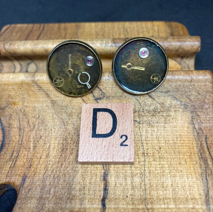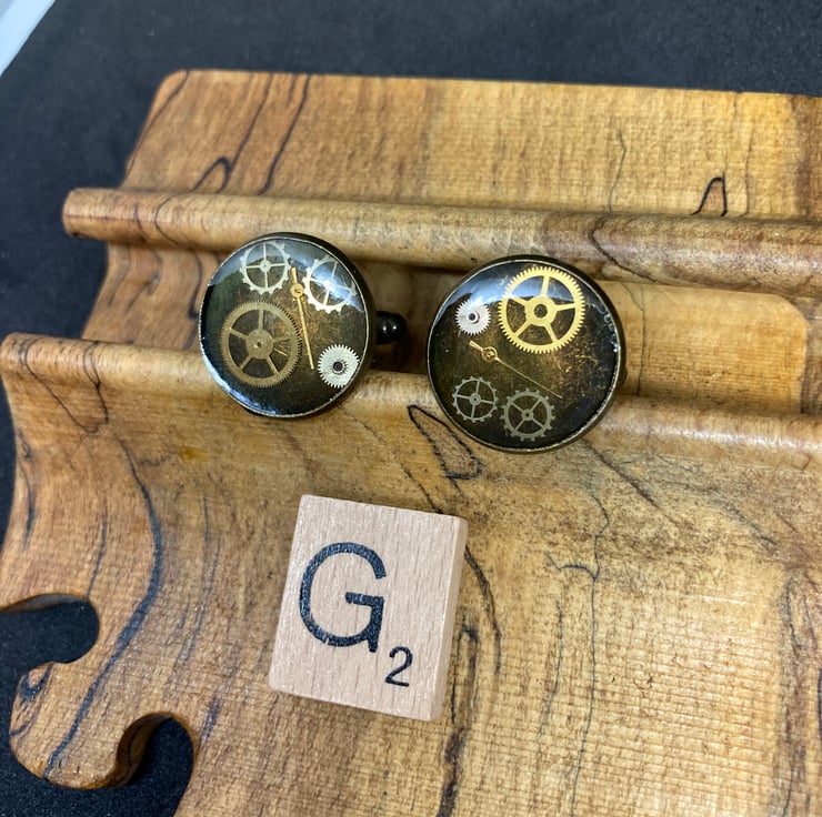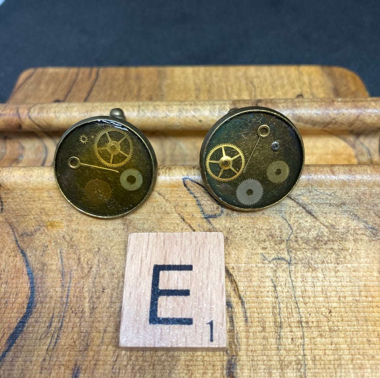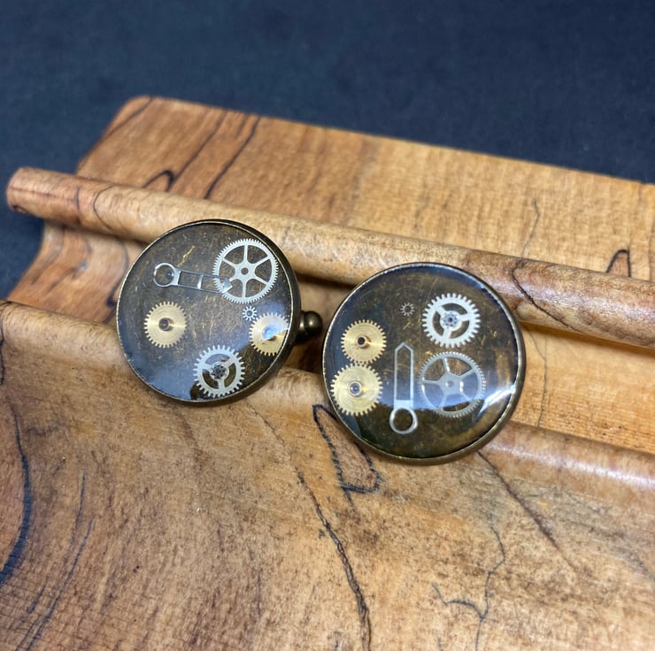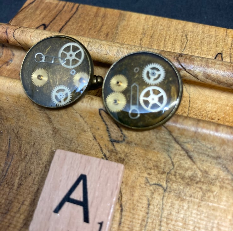 Inspired by steampunk design. Tiny watch parts captured in resin with a bronze setting.