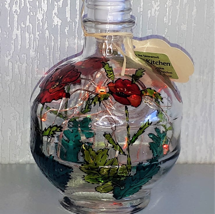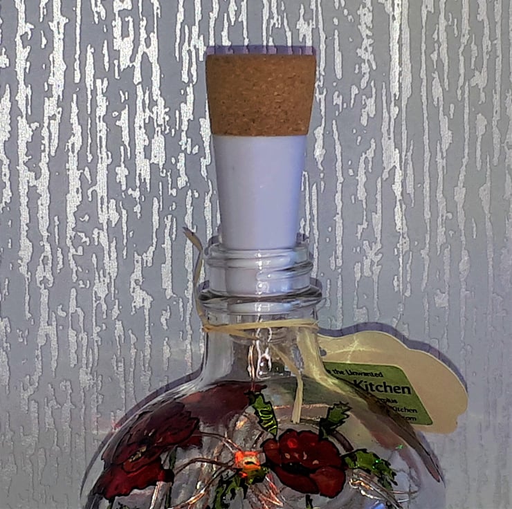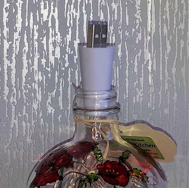 Lit by a multicoloured static rechargeable 15 LED light string with cork. It switches on by twisting the clear plastic at the base of the cork, and recharges via USB by pulling off the cork cover. All bottles are upcycled.