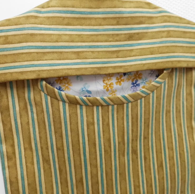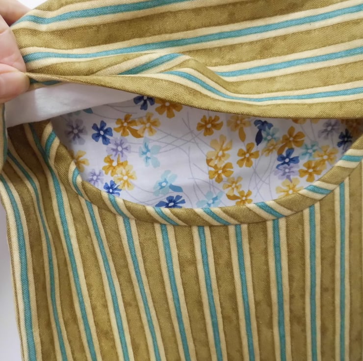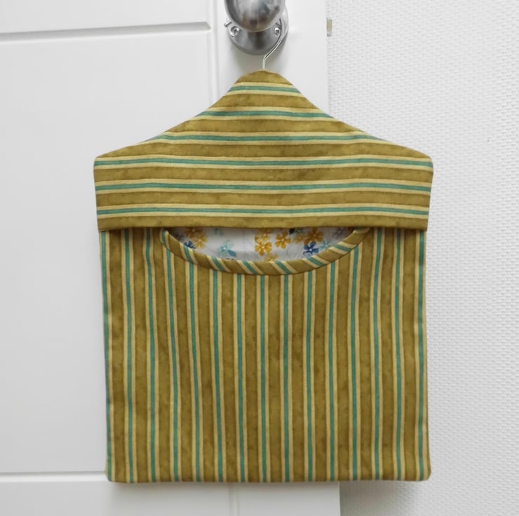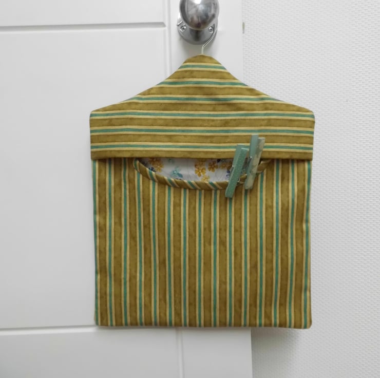 A fully lined peg bag carefully made using a sturdy furnishing weight cotton fabric in mustard with turquoise stripes. The back is lined with floral printed cotton featuring similar colours and you can see this through the opening. The front is lined with white cotton fabric.