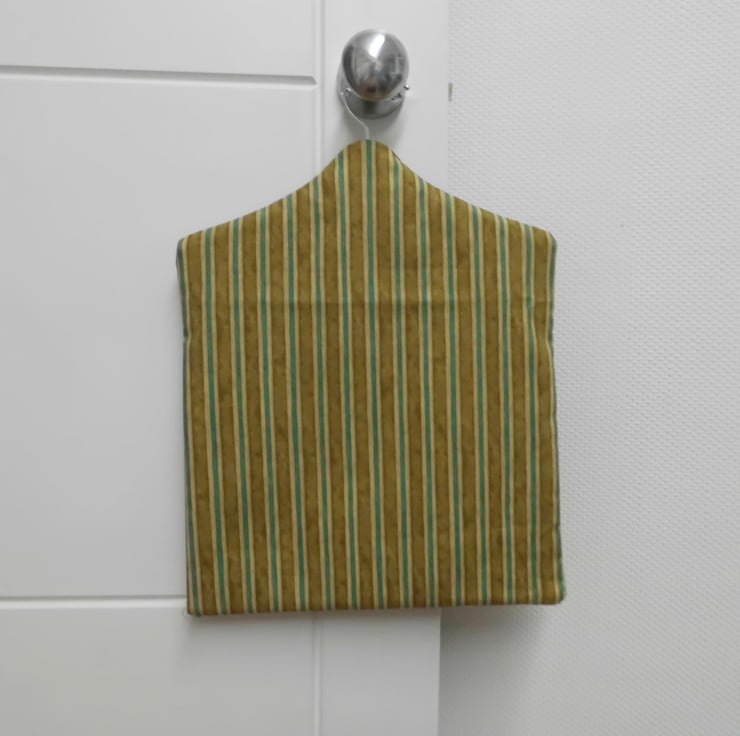 I have made bias binding from the striped fabric to bind the opening. On a wooden coat hanger so it can hang on your line, in your kitchen or laundry room. I have used an overlocking stitch all around inside for strength and neatness. The design of my peg bags means that the upper and lower fronts are both supported by the hanger, which gives them added strength.