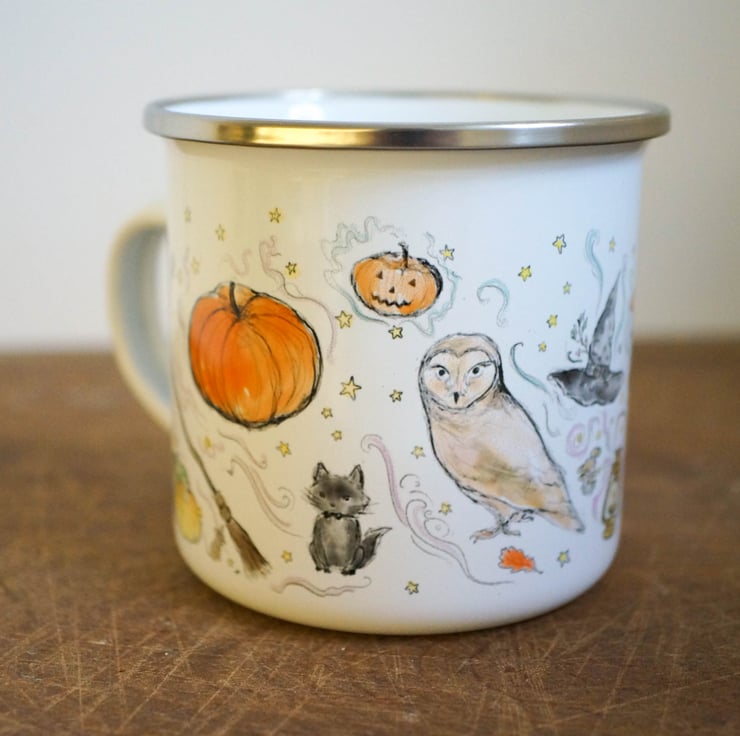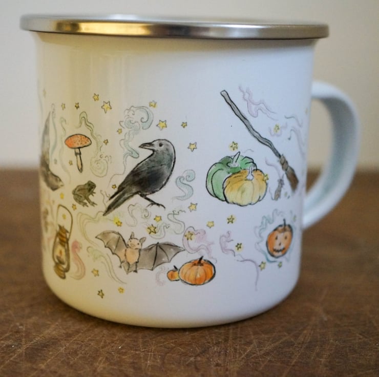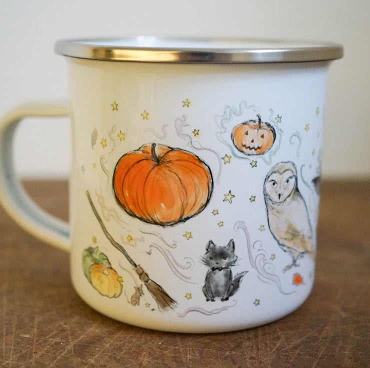Autumnal and halloween inspired watercolour artwork printed onto an enamel mug.