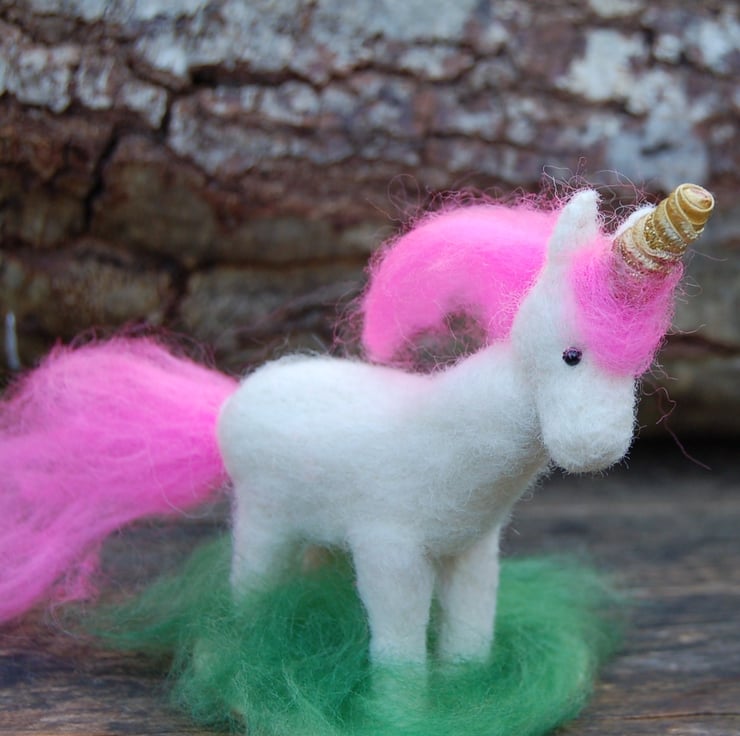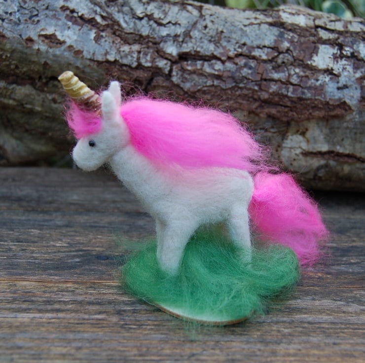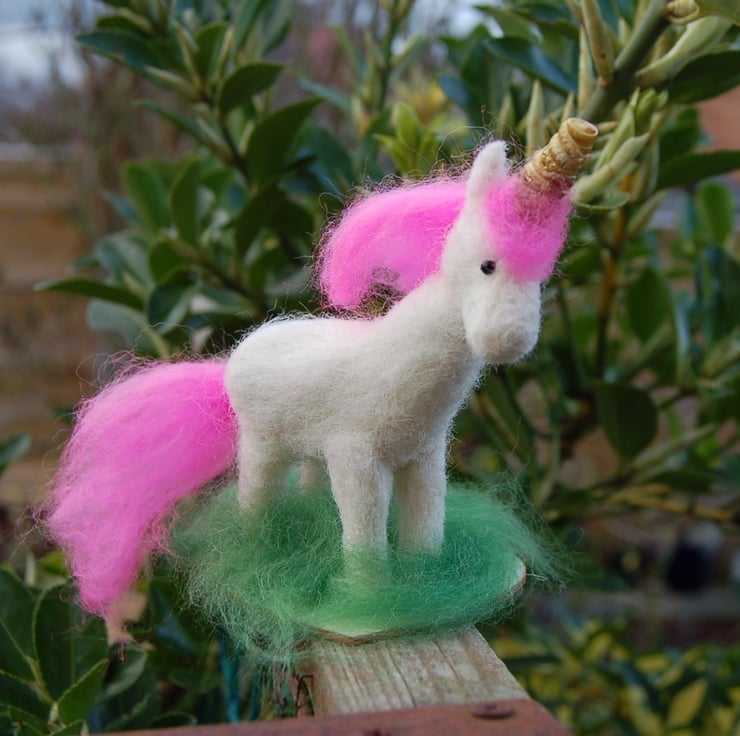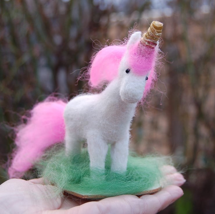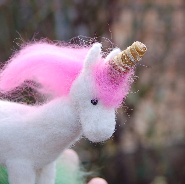 Made from needle felted soft Shetland white sheep wool and fluffy pink merino wool fibres. Aubrianna's gold horn is a length of vintage lace ribbon would tightly into shape.