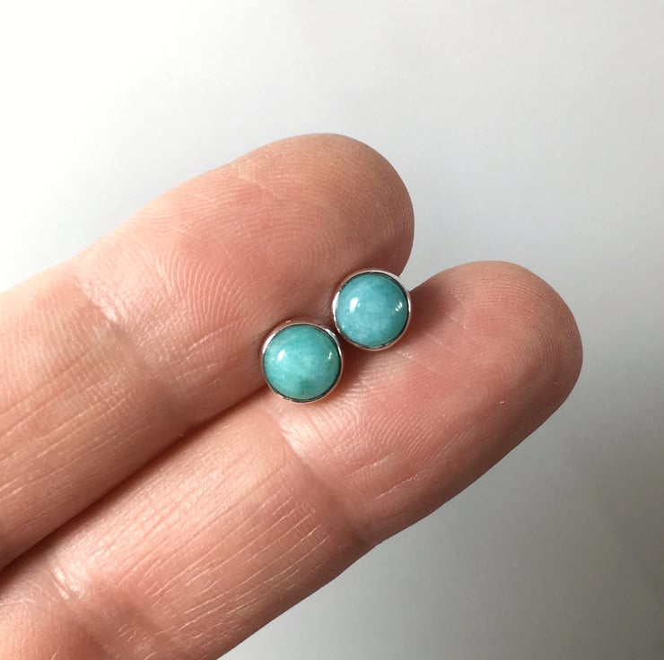 The amazonite cabs measure 6mm diameter. The silver has been polished to a bright finish.