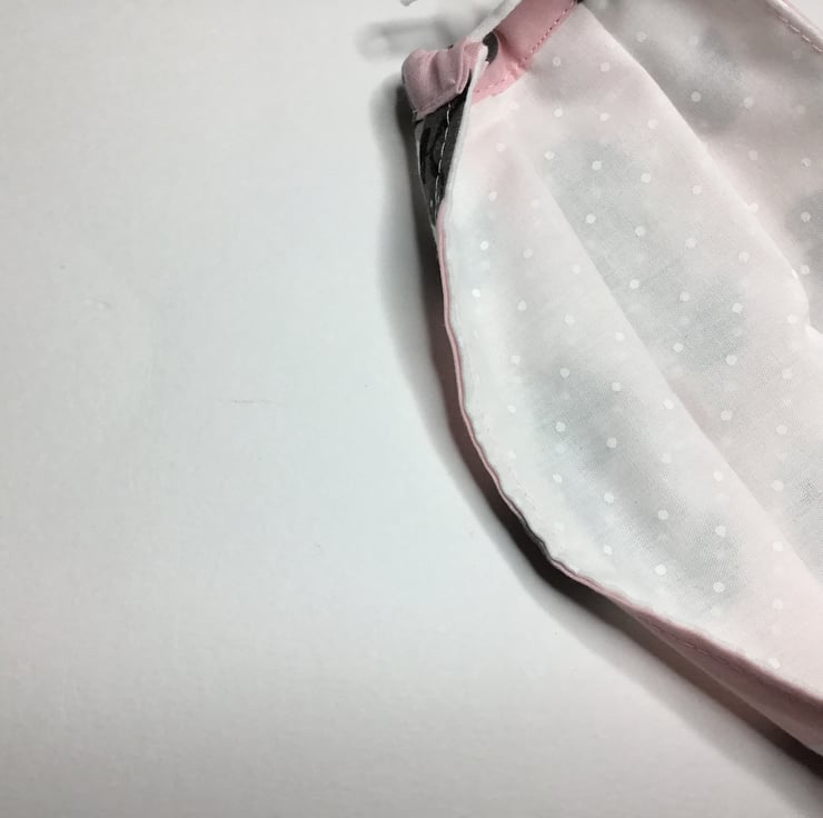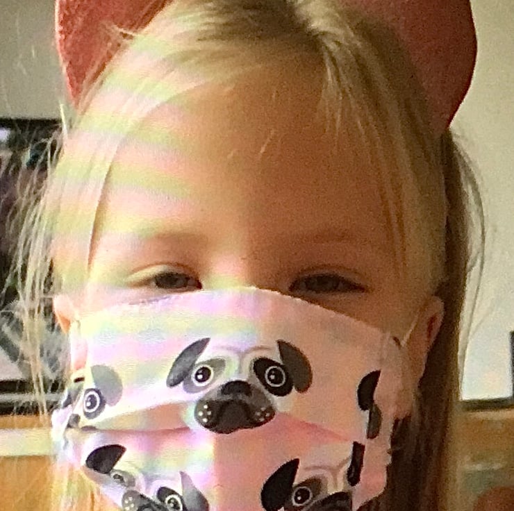 Child’s 3 layered face covering with soft elastic ear loops for adjusting to size by an adult.