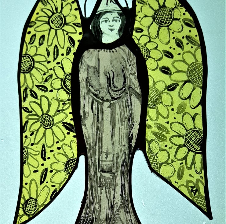 2020 has found me looking for beauty and protection from the outside world in art and my home. I happened across a vintage greetings card from the 1920's with a serene and stylish angel image and gave me the inspiration for a series of angels. I live in Devon, and her wings are painted with sunflowers in celebration of the sunflowers that are still going strong in my garden as autumn takes over. This Guardian Angel is a unique little ray of light for 2020. I started making them to hang in your home and act as protection against the stresses and problems of the outside world.