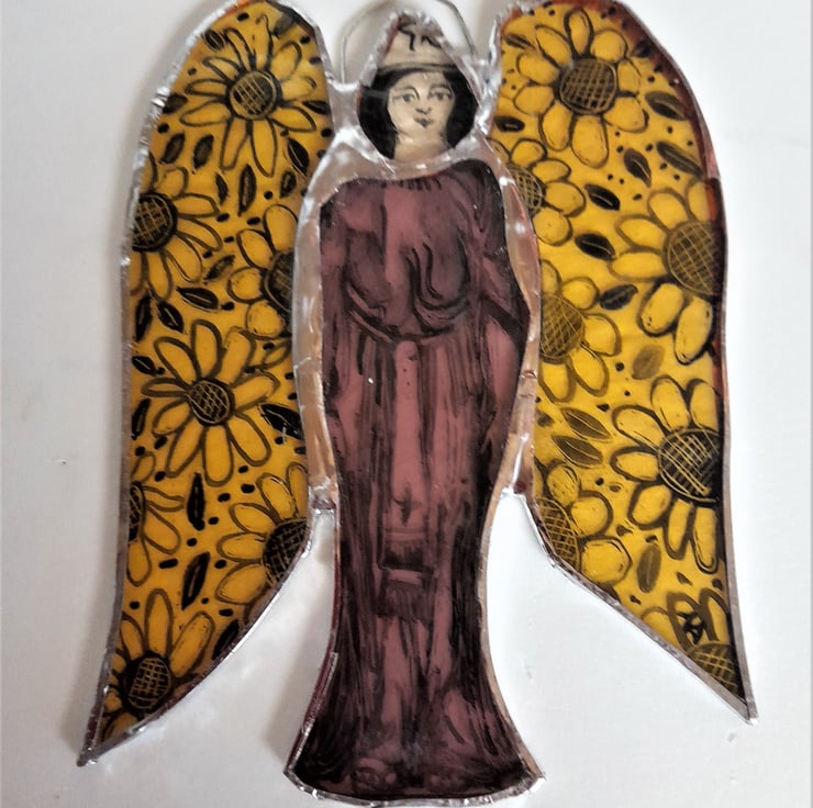 This small, gorgeous stained glass angel would make a perfect gift. Inspired by a vintage greetings card from the 1920's and will look fabulous hanging in a sunny window or on a Christmas tree. Her dress is a dusky pink cathedral glass and her wings are a wonderful amber yellow glass, with hand painted sufnlowers. I have painted her in kiln fired glass enamels, just like a church stained glass window and when she came out of the kiln I put her together using the copper foil, or Tiffany Technique. She is a unique piece of art glass and a perfect Christmas gift