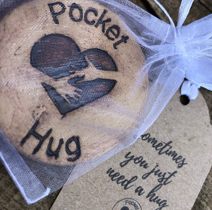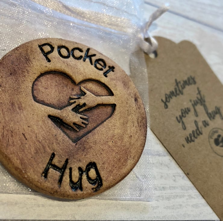 A beautiful tactile pottery pocket hug featuring my own personal design. Presented in an organza bag with a tag ‘Sometimes you just need a hug’. The tag is left blank on the other side so you can write your own message.