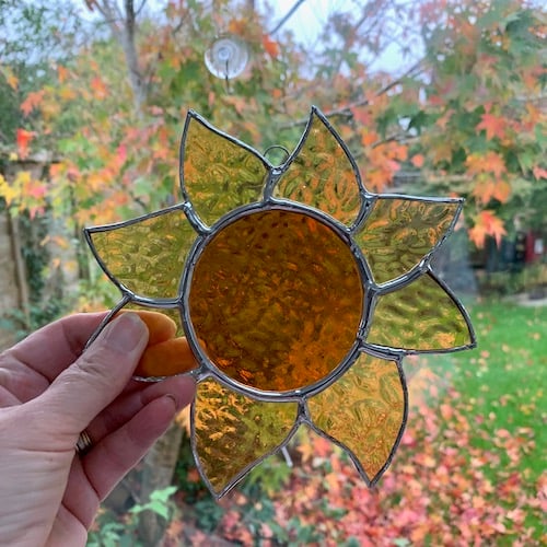 Each piece of glass has been hand cut, ground, washed, foiled and soldered together, Before being washed and polished. A ring has been attached for hanging purposes.