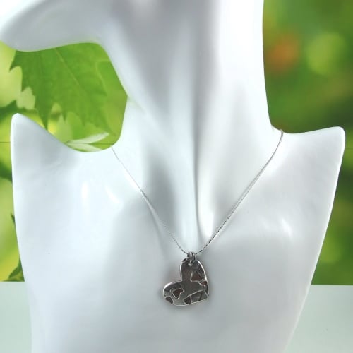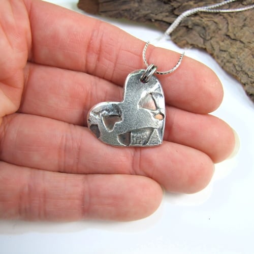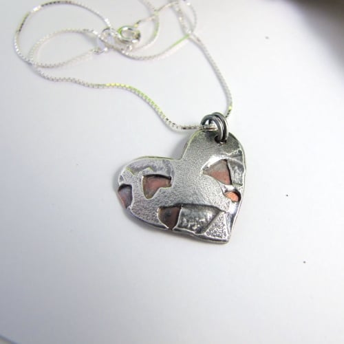 Created from a copper heart base cut from copper sheet then layered over recycled silver sheet and soldered together to fuse together in a lattice design with little flashes of copper showing through. Fitted to Sterling Silver Chain.
