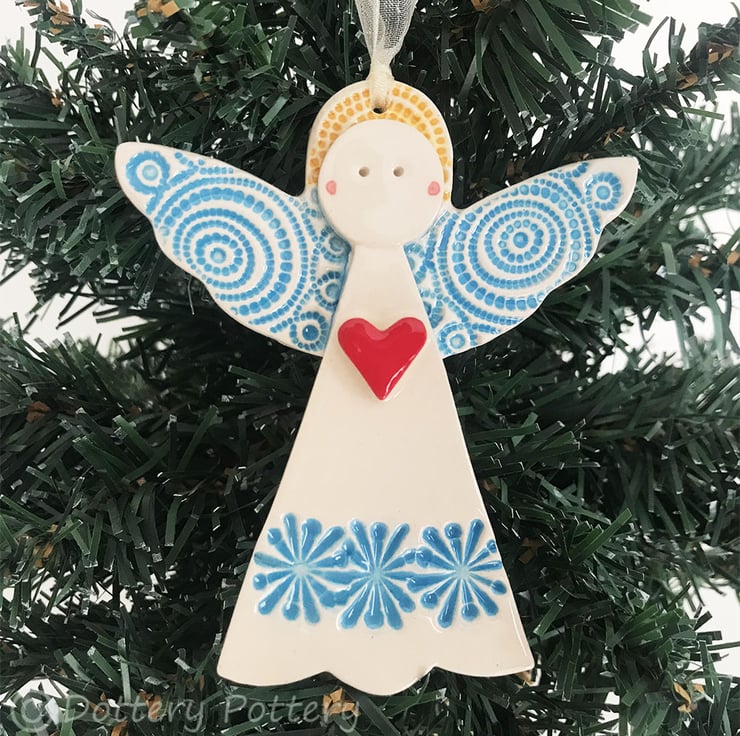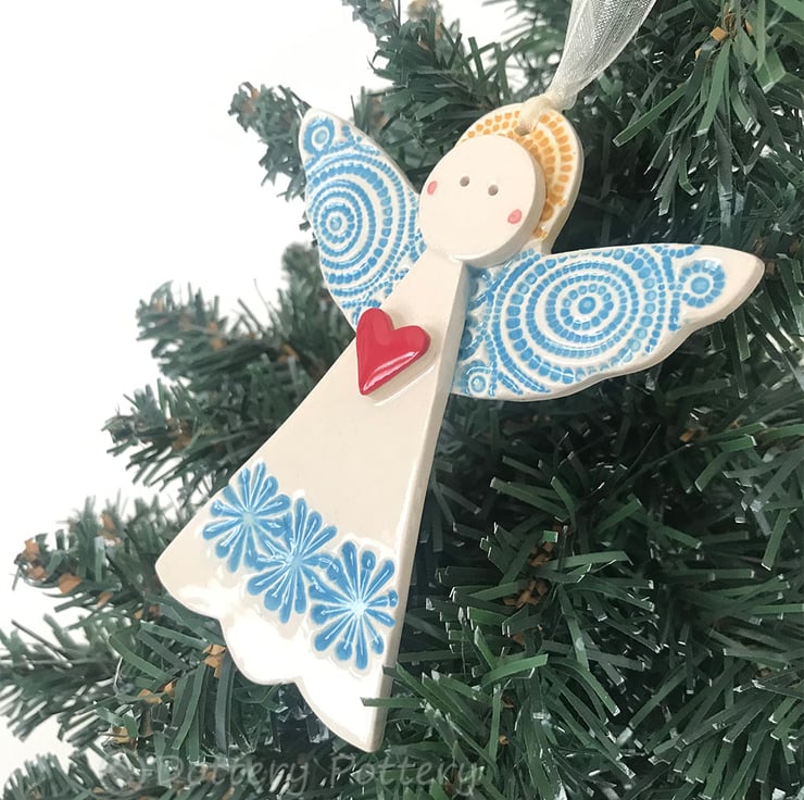 This is the price for ONE angel. These cute little angels are made from white earthenware clay and decorated with coloured slips and glazes. They are fired twice. They are glazed on the front only. She measures 8.5 cm high and 7 cm wide.