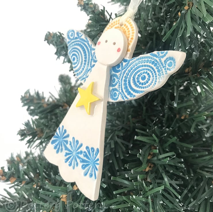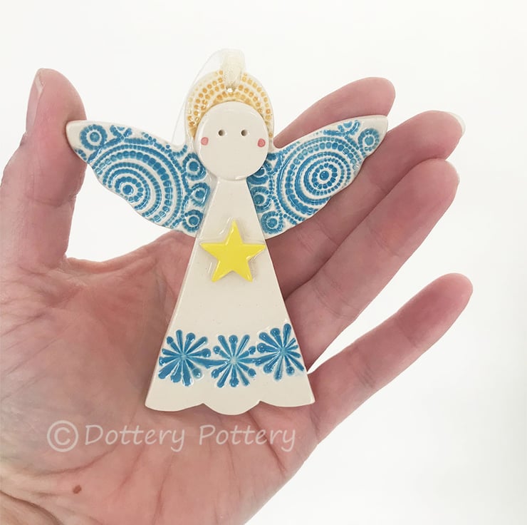 This is the price for ONE angel. These cute little angels are made from white earthenware clay and decorated with coloured slips and glazes. They are fired twice. They are glazed on the front only. She measures 8.5 cm high and 7 cm wide.