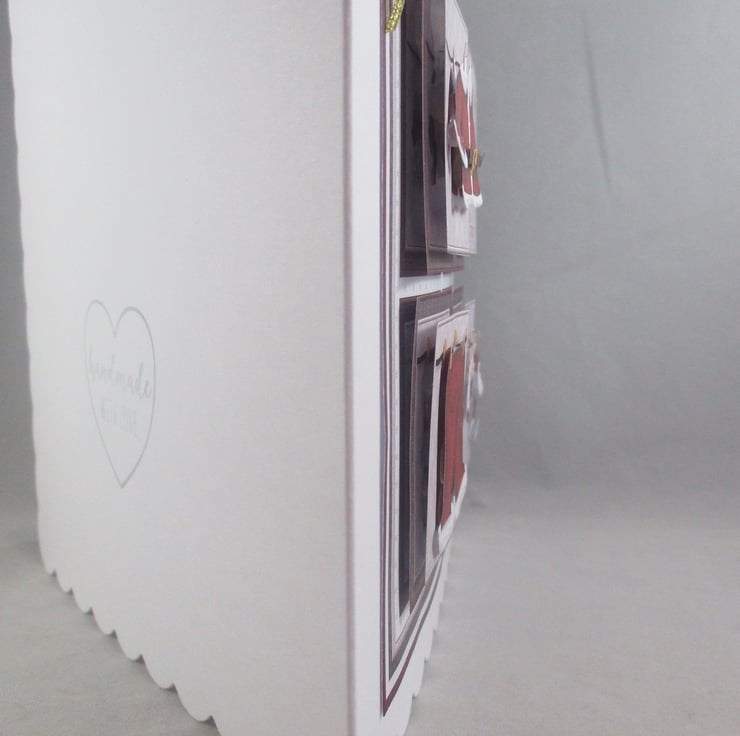 A white square scalloped edge card measuring 145x145mm(5.75x5.75in) has a decoupage/3D effect design of Santas washing line