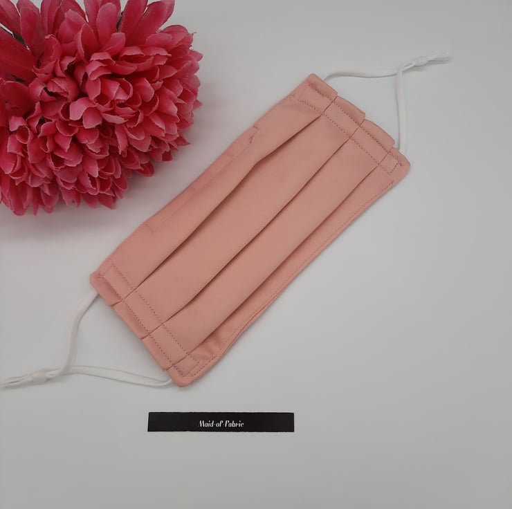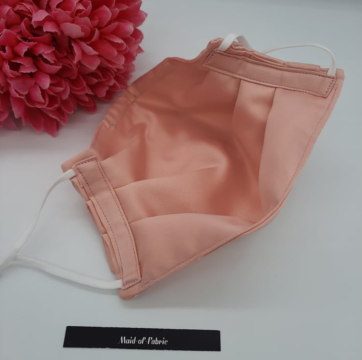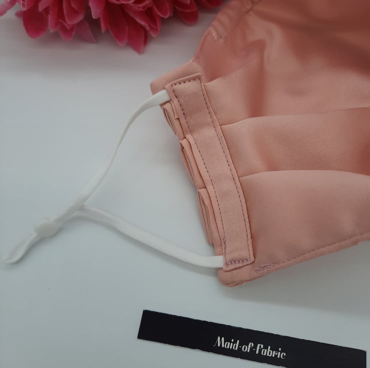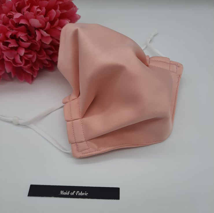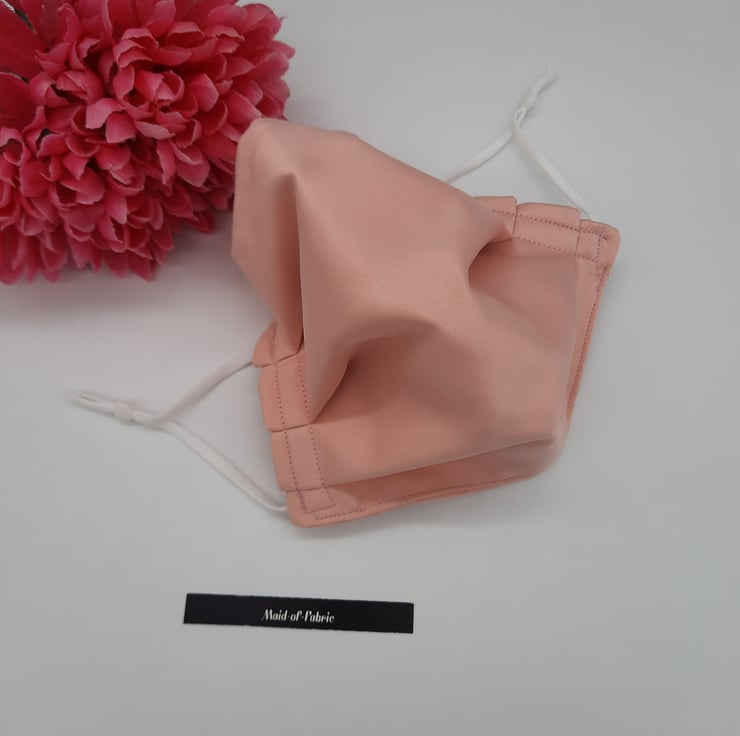 Face mask made using a pink satin feel fabric, adjustable soft white elastic and a 9cm flat bendable nose wire.