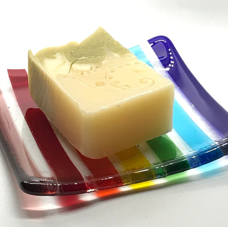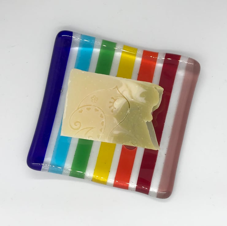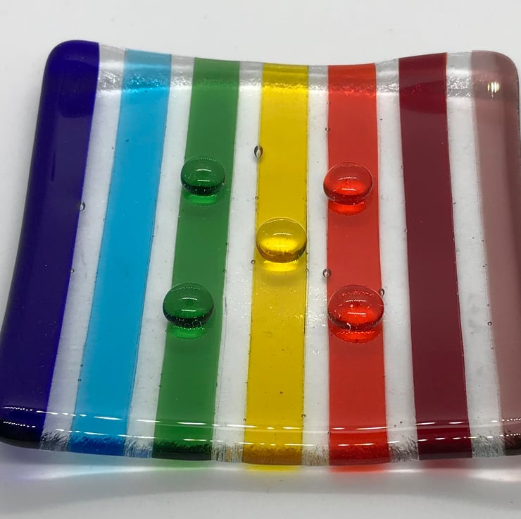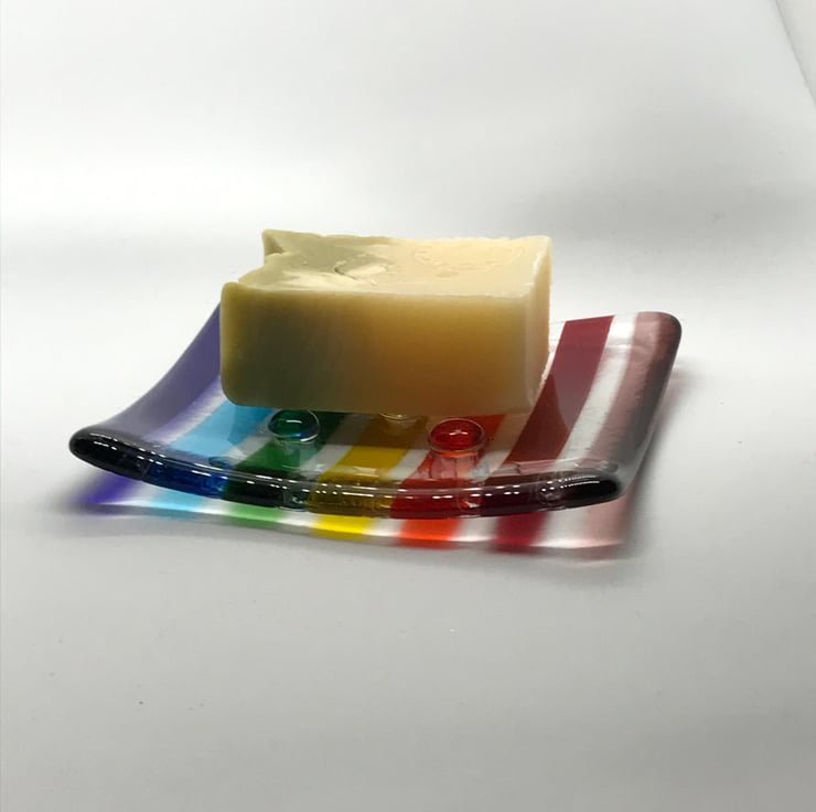 Many of us are now ditching single use plastic containers and instead using solid bars of soap and shampoo so a pretty soap dish makes a perfect gift or a lovely addition to your home. Brighten up your bathroom or kitchen with this colourful dish. Carefully cut coloured glass is fused three times in my kiln to make this pretty soap dish. The little nuggets help prevent the soap going soggy by holding it above the dish. The dish measures approximately 10cm x 10cm.