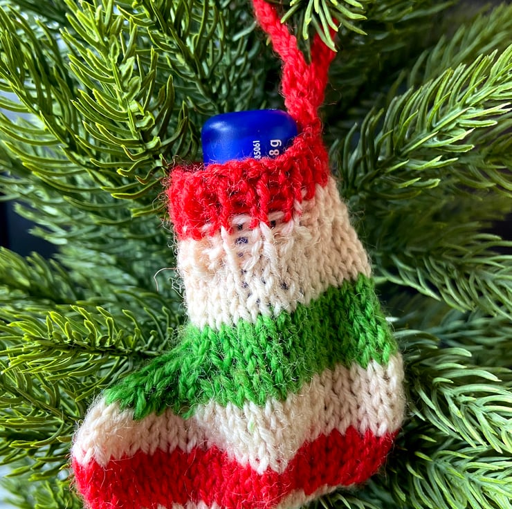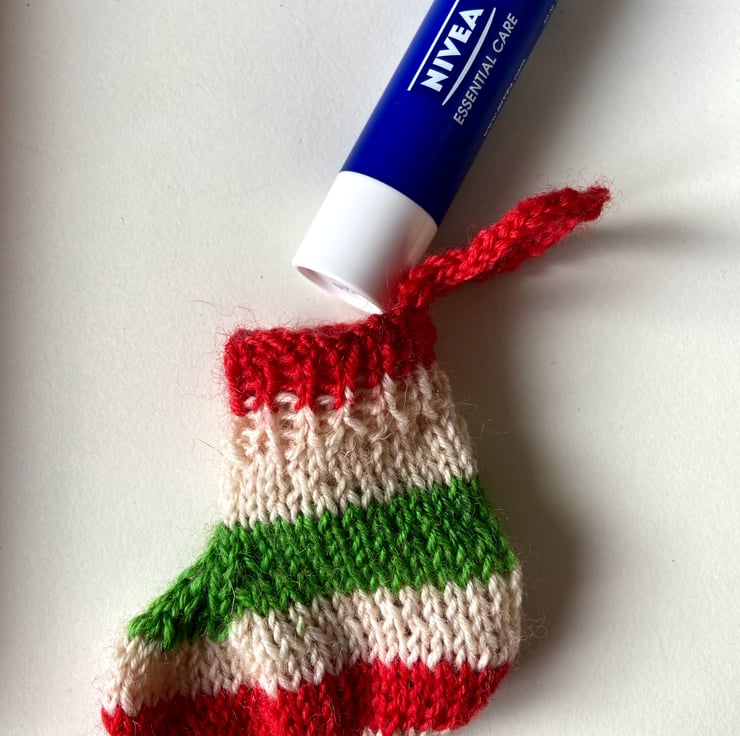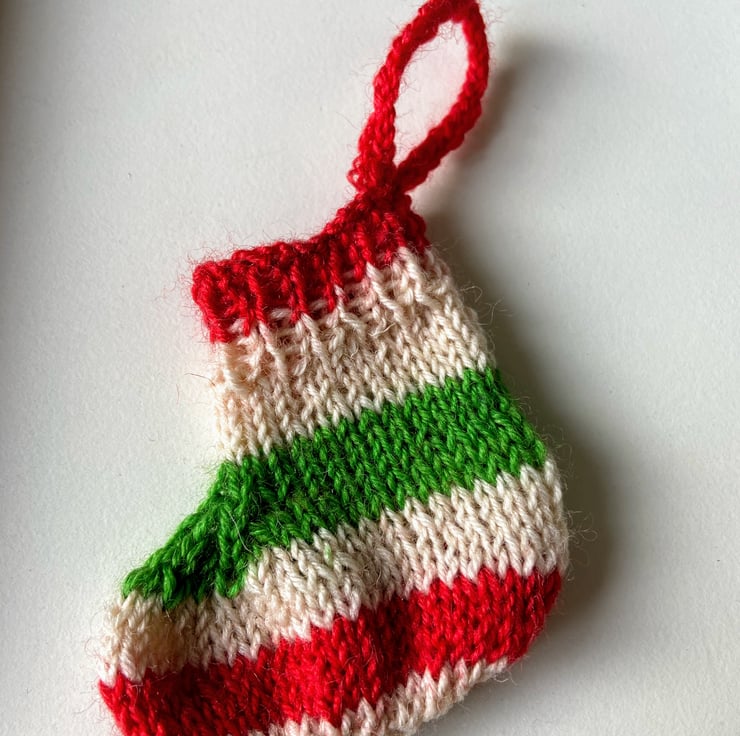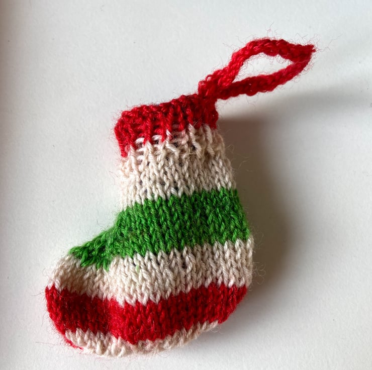 This is a cute little Christmas stocking hand knitted in red, green and white yarn with a little loop for hanging. Perfect for holding a little gift, such as lip balm (not included), on your tree.