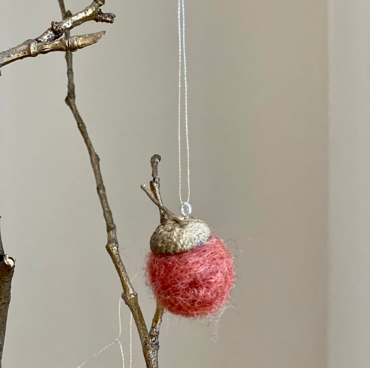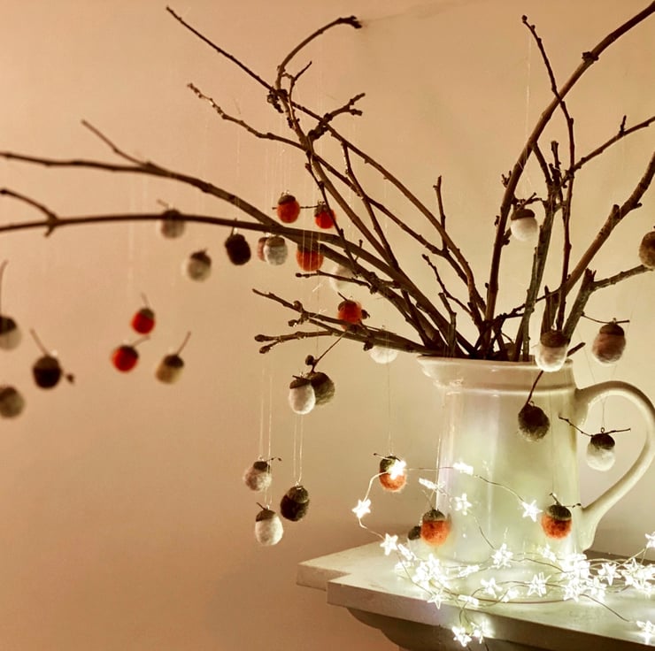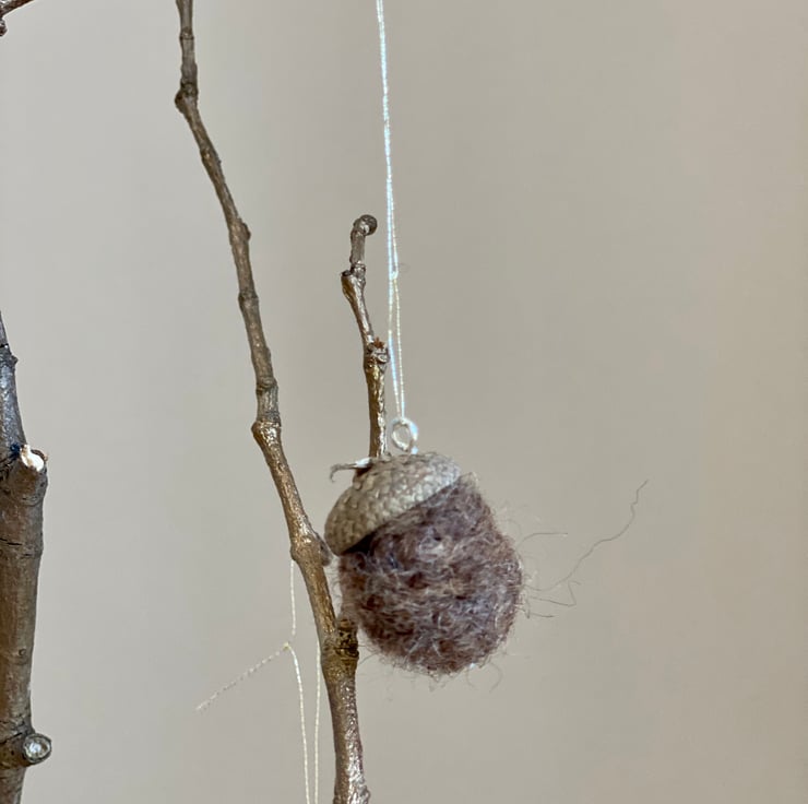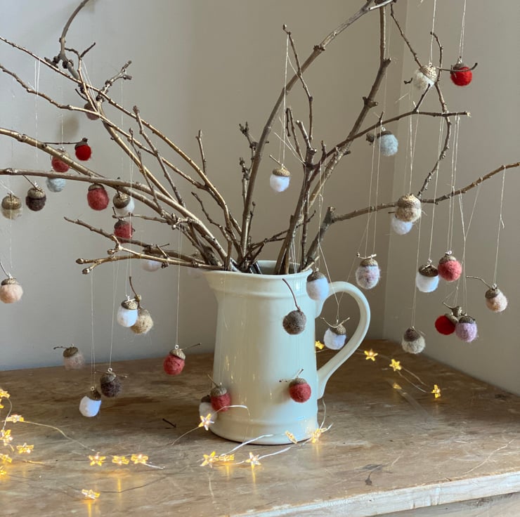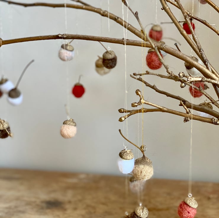 Wolf & Bee needle felted acorns in various different, autumnal colours from pure white, soft cream, natural brown to russet and bright red.