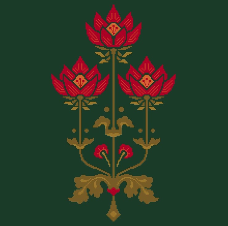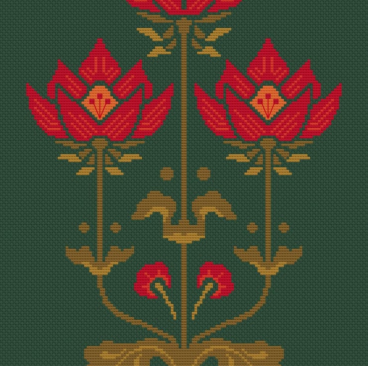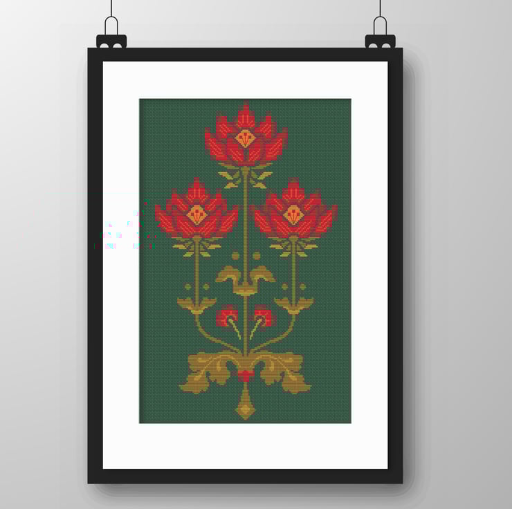 Adaptation from a ornamental plate from architect and designer Christopher Dresser in 1876 from his book Studies in Design these delightful Art Nouveau stencil Pointsettia flowers make a great addition to the Christmas holidays with their rich red and green hues and uses only 5 colours - Vintage cross stitch/tapestry PDF counted chart Instant download by Vivsters - No. 203