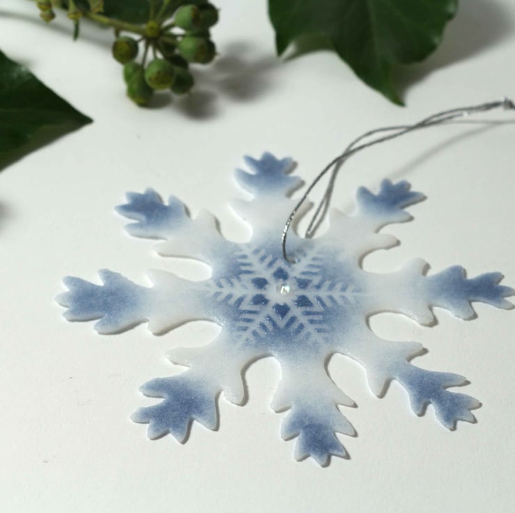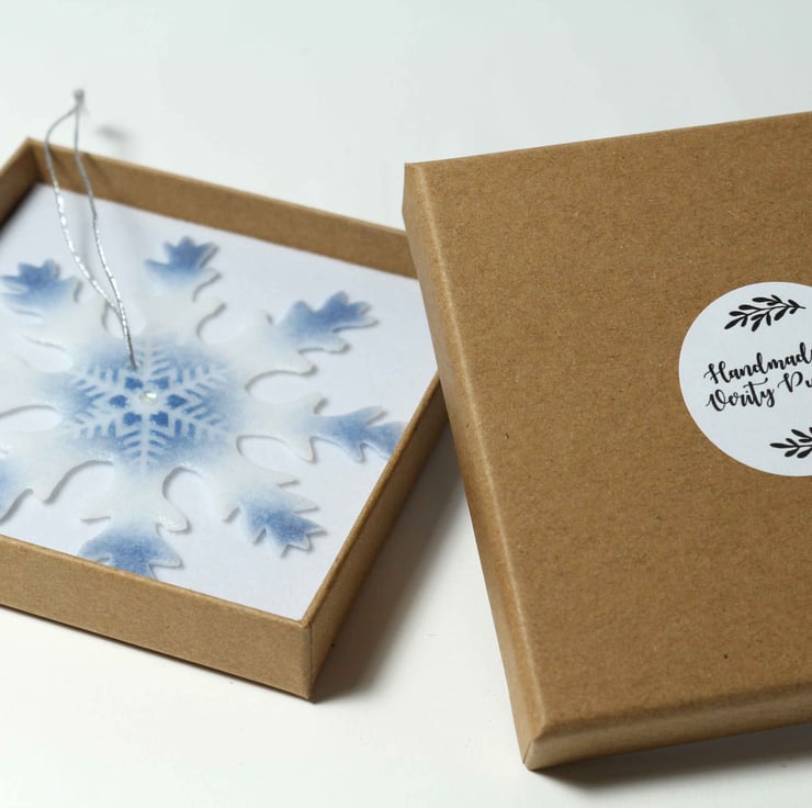 These delicate, beautiful and unique snowflakes are handmade by Verity in her glass studio in rural North Wales. This larger snowflake is 100mm across with a beautiful little dichroic rainbow dot at its center. It comes beautifully gift wrapped in its own box- making a lovey gift or just for your own home - adding a new, very special decoration on your Christmas tree this year.