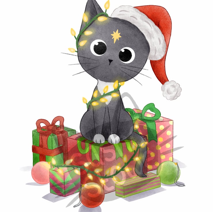 Decorate your walls this Christmas with this Giclee print of a grey cat sitting on top of a pile of presents wearing a Santa hat and fairy lights. The original artwork was done digitally by me.