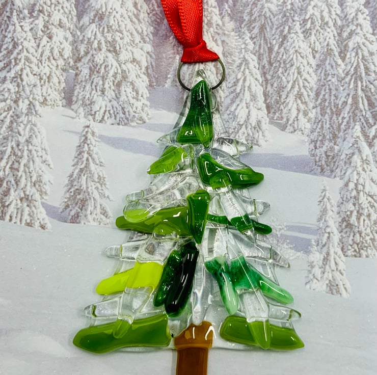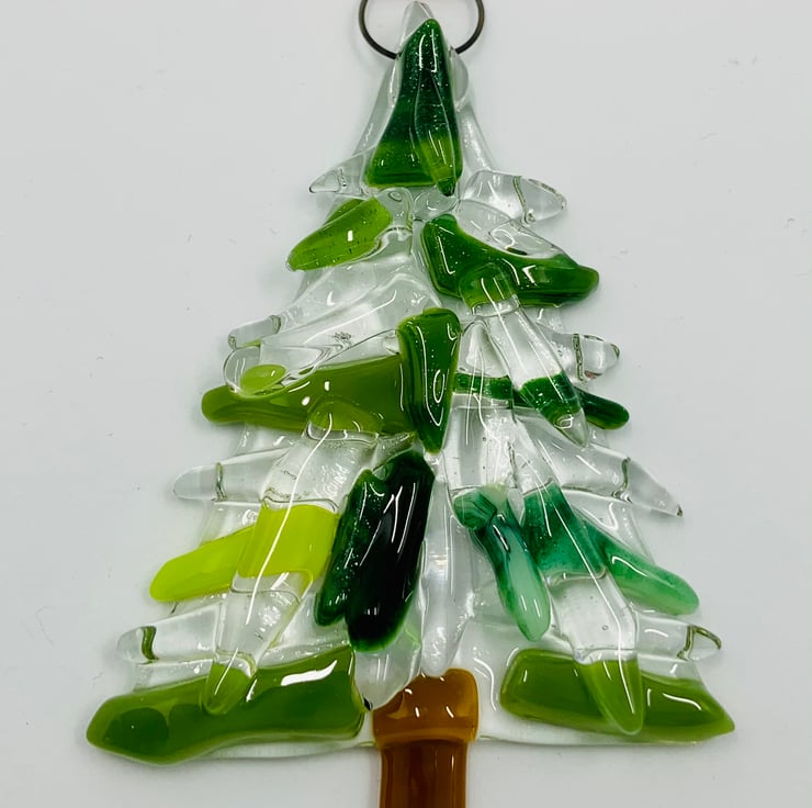 Handmade Fused Glass Xmas Tree Hanging Christmas Decoration.