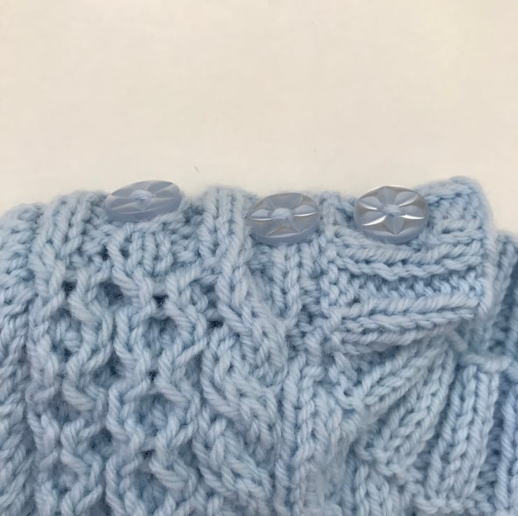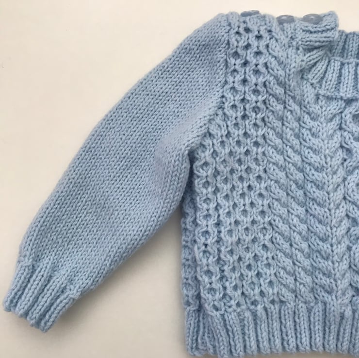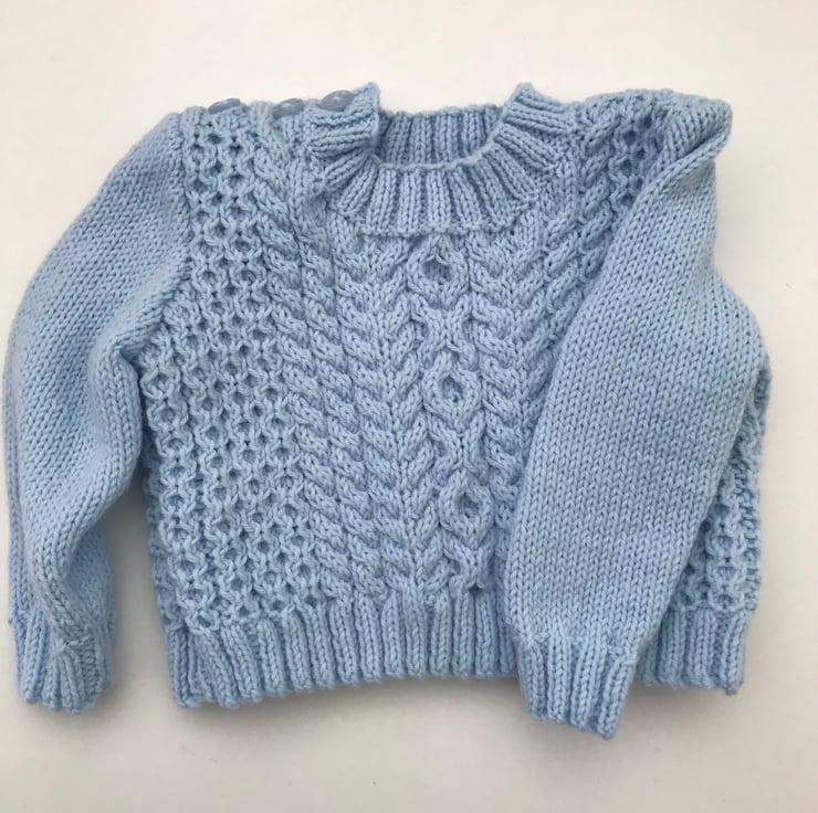 This cable jumper is hand knitted in a soft baby yarn. It features four different cable patterns on the front and back. The sleeves are plain and it fastens on the shoulder with three buttons.