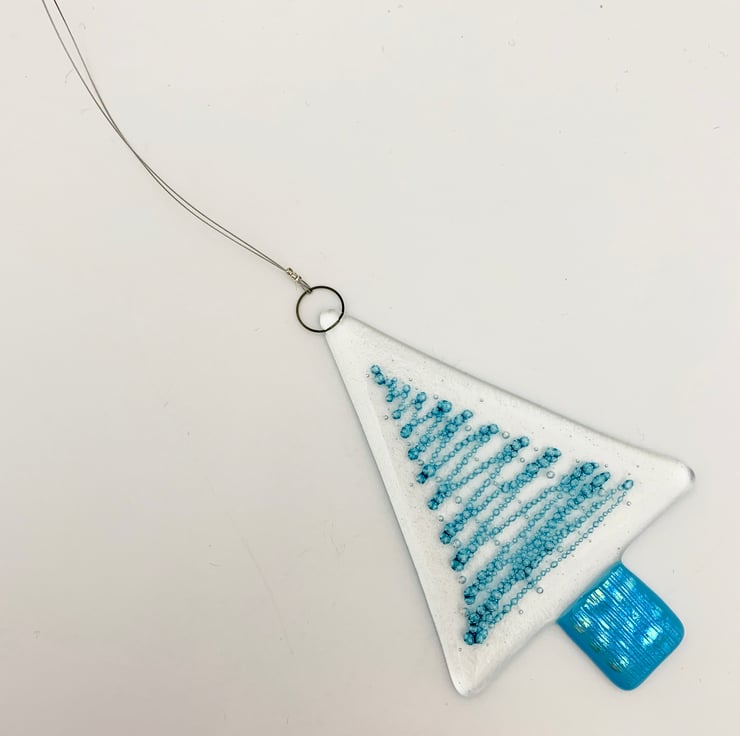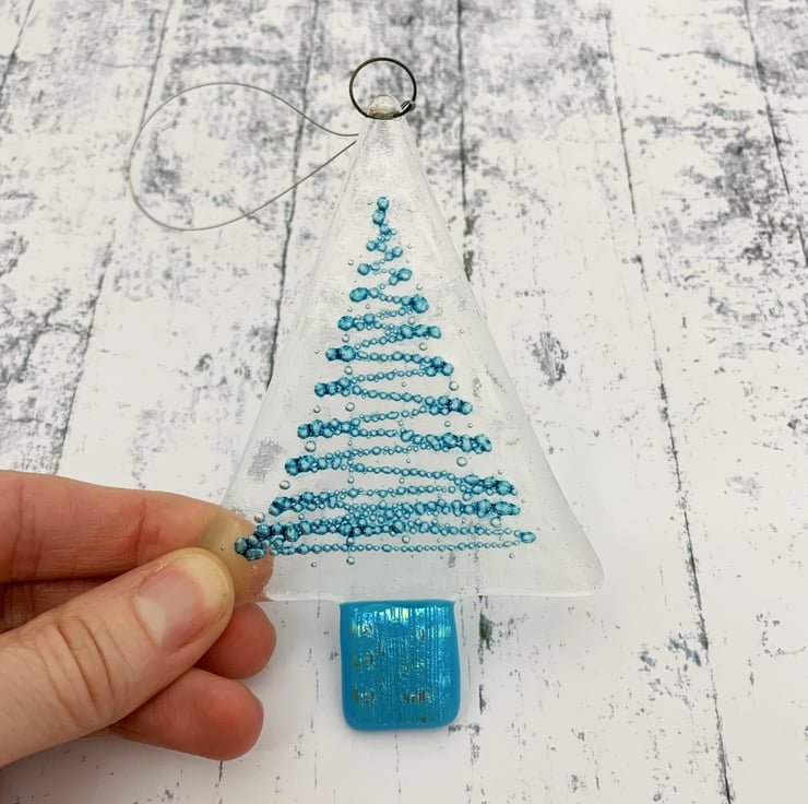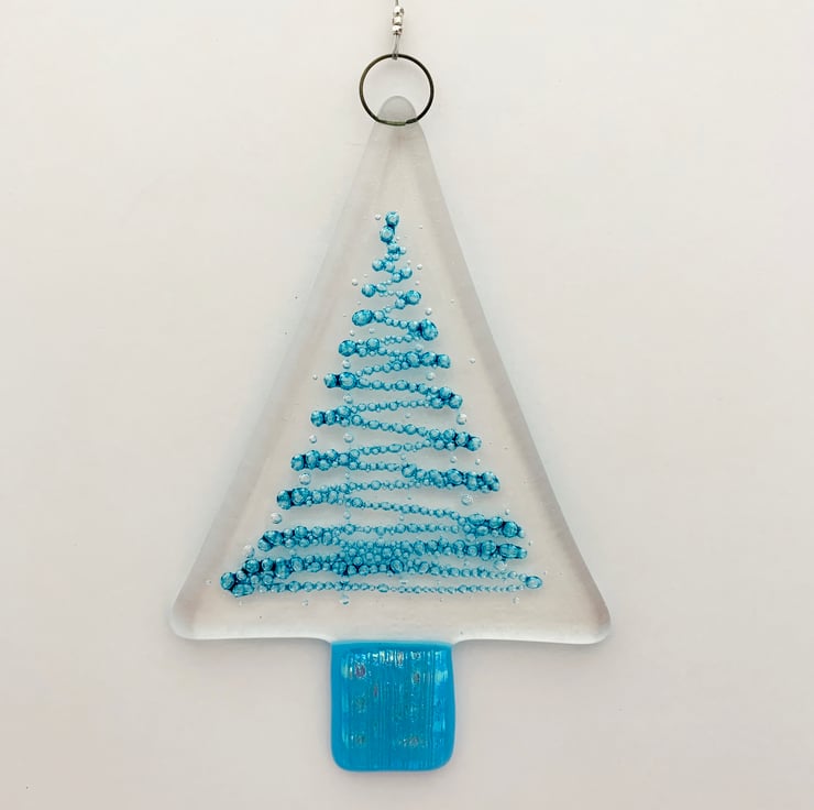 Fused glass hanging Christmas tree. Clear glass with turquoise bubbles captured inside. The pot at the bottom is opaque glass fused with dichroic glass, adding a bit of sparkle. The glass is handcut and assembled, therefore no 2 are exactly the same. This looks lovely in a window, on the tree, or anywhere you fancy!