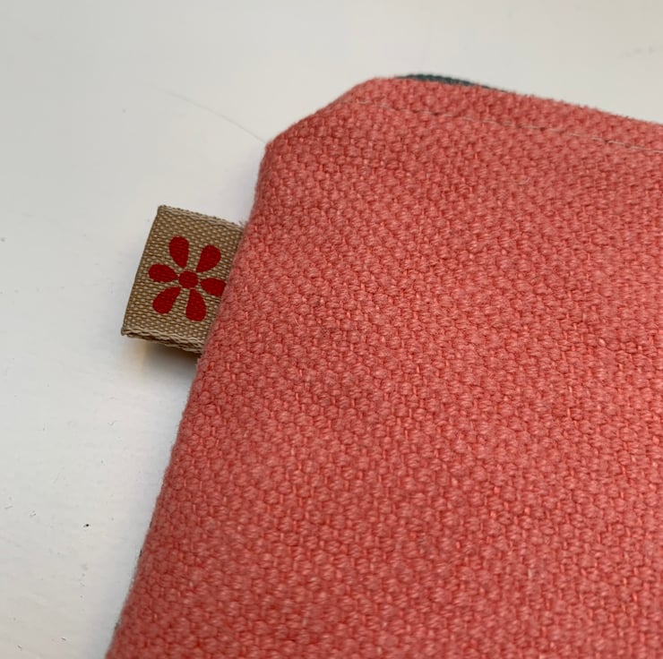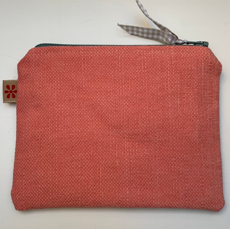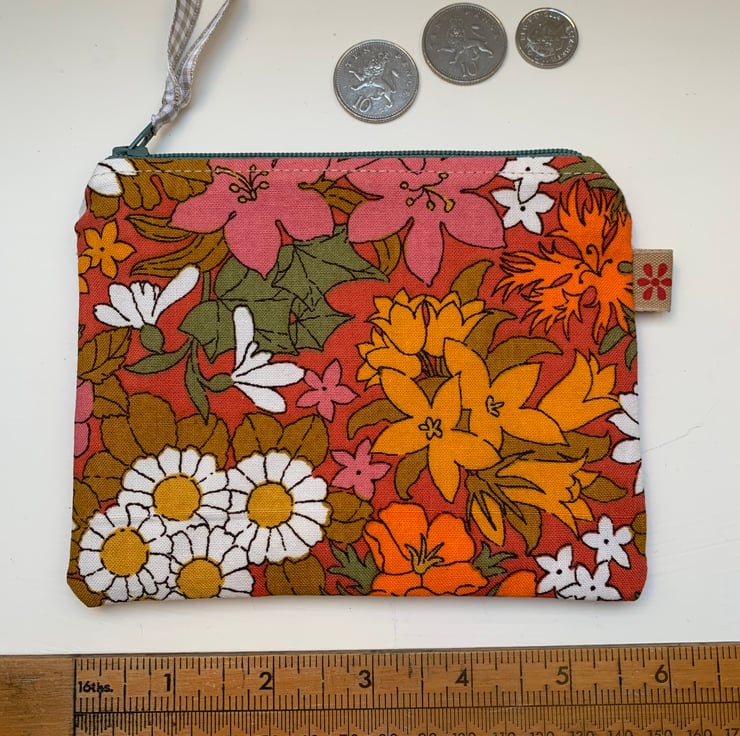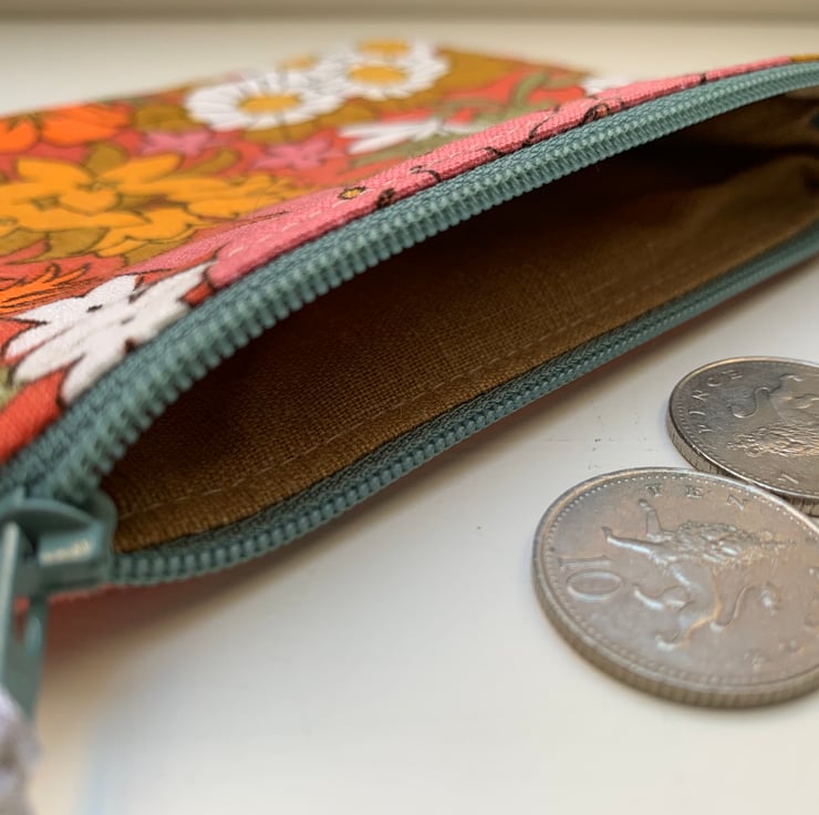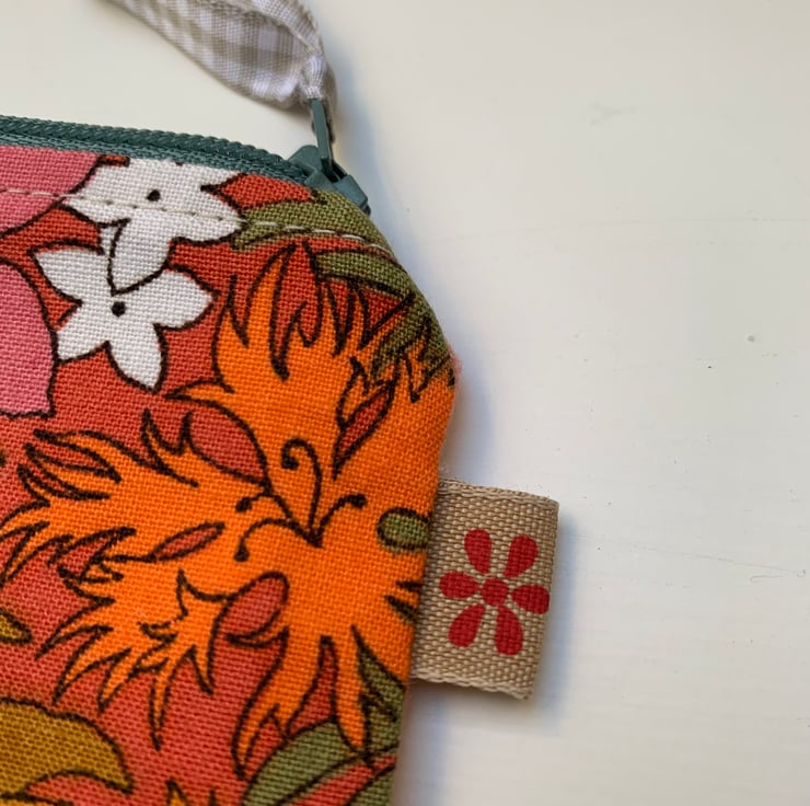 Small zip pouch made from vintage Sanderson Amabel cotton in bright pinks and oranges. Backed with thick soft coral cotton.