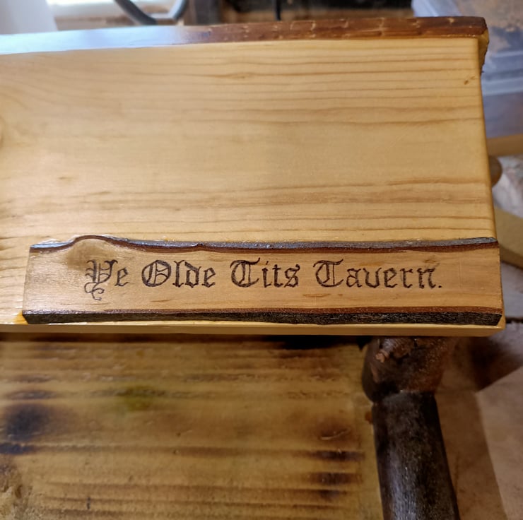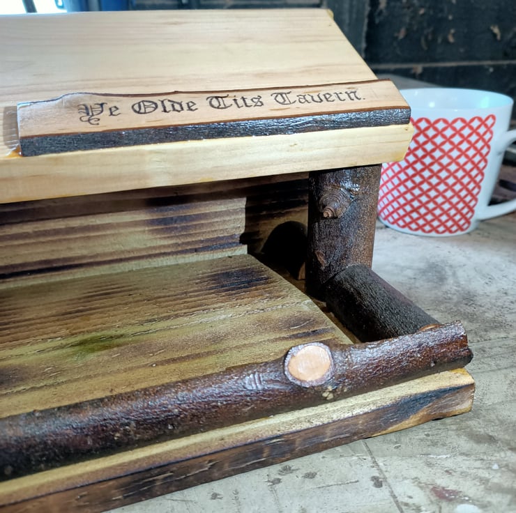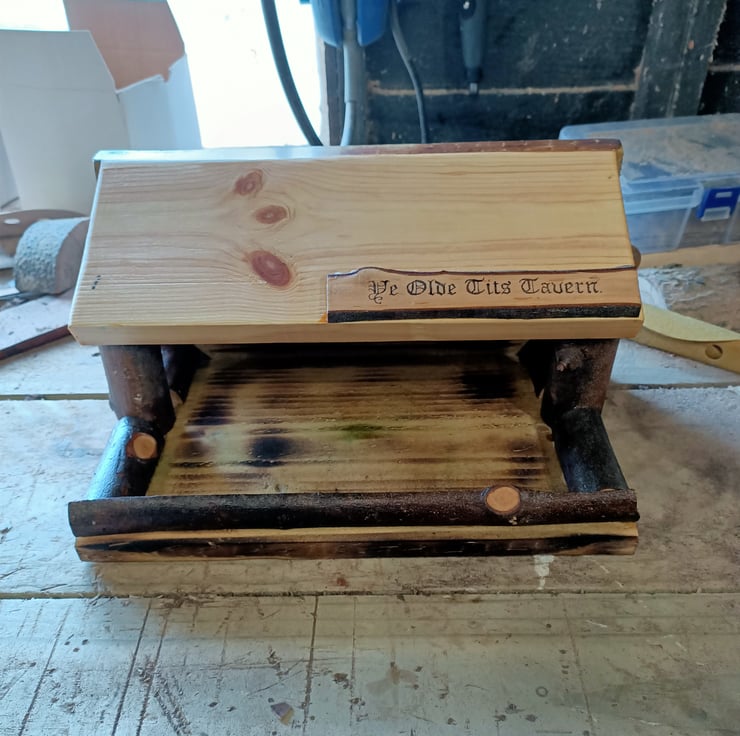 Wooden reclaimed timber bird feeder blue tits and coal tits. Ye Olde Tits Tavern has been made using reclaimed wood. We have made this feeder in the style of a tavern for small garden birds and especially tits. The construction is from solid Scots pine on the base, back and roof. It has been decorated with log pillars and trims. This feeder has a charming name which has been pyrographed onto a log sign on the front of the feeder. The feeder has had a thin coat of non toxic varnish to help protect from weathers. This feeder comes with brass brackets already on the back for easy positioning onto a wall or fence. Please ensure safe positioning of the feeder away from predators.