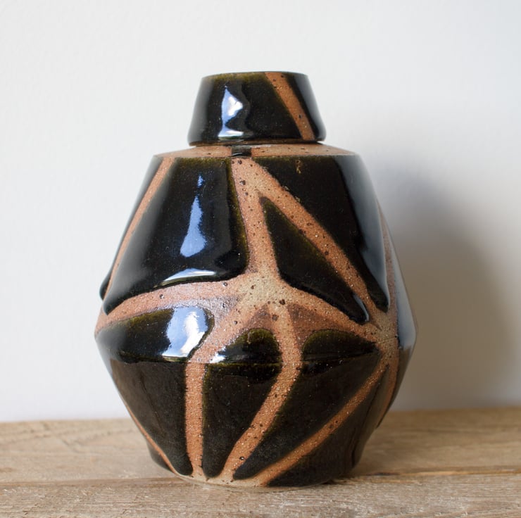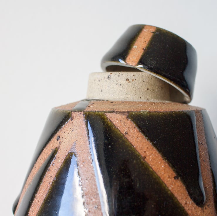 Wheel thrown bottle with lid decorated with geometric lines and triangles. The clay body used is a lava fleck which contains small particles of iron. These melt during the glaze firing (1260C) and react with the glaze and create small speckles.