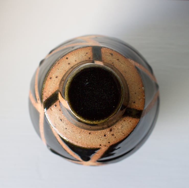 The inside has a transparent glaze while the outside has been glazed in a dark green. The geometric lines were created with thin masking tape prior to glazing; once this was removed it leaves the raw clay surface unglazed. This becomes toasted by the glaze at the edges giving a nice orangey hue to the fired clay. Removing the lid shows the contrast between the toasted and untoasted clay.