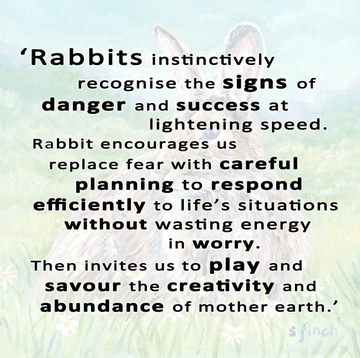Rabbits instinctively recognises the signs of danger and success at lightening speed. Rabbit encourages us replace fear with careful planning to respond efficiently to life's situations without wasting energy in worry. Then invites us to play and savour the creativity and abundance of mother earth.