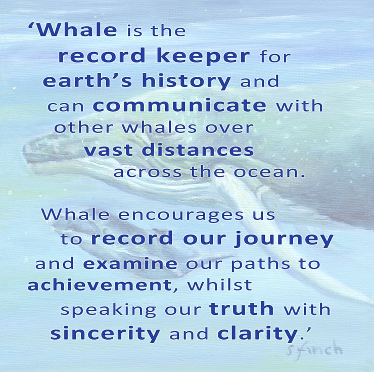 Whale is the record keeper for earth’s history and can communicate with other whales over vast distances across the ocean. Whale encourages us to record our journey and examine our paths to achievement, whilst speaking our truth with sincerity and clarity.’