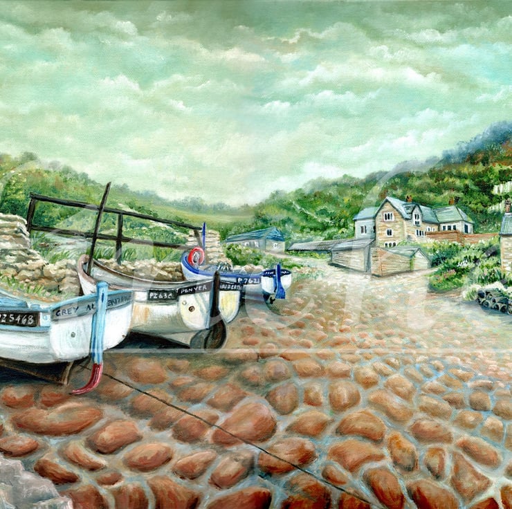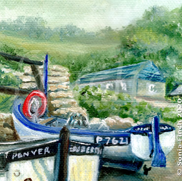 I was inspired by the beautiful village of Sawle depicted in the book 'Poldark' which was filmed at Penberth. The cat is my cat that I had as a child.