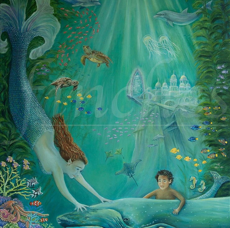 A few years ago, a much admired and inspiring contactee for Andromeda - Alex Collier, discussed how Atlantis and Mu may one day reveal themselves to us as sea levels change and he gave indications of their locations and discussed life in those times. These ideas provided a wealth of inspiration for me to produce a painting that combined both mermaids, dolphins and a hump back whale, as well as many other beautiful aquatic life for children.