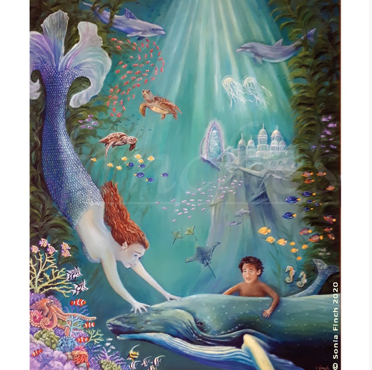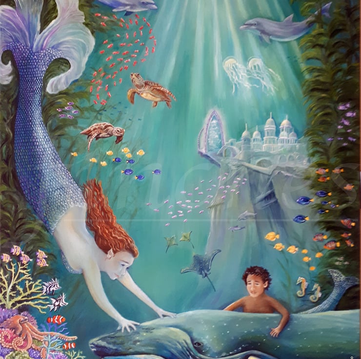 A few years ago, a much admired and inspiring contactee for Andromeda - Alex Collier, discussed how Atlantis and Mu may one day reveal themselves to us as sea levels change and he gave indications of their locations and discussed life in those times. These ideas provided a wealth of inspiration for me to produce a painting that combined both mermaids, dolphins and a hump back whale, as well as many other beautiful aquatic life for children.