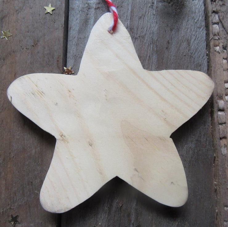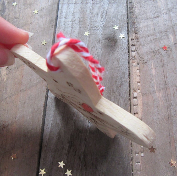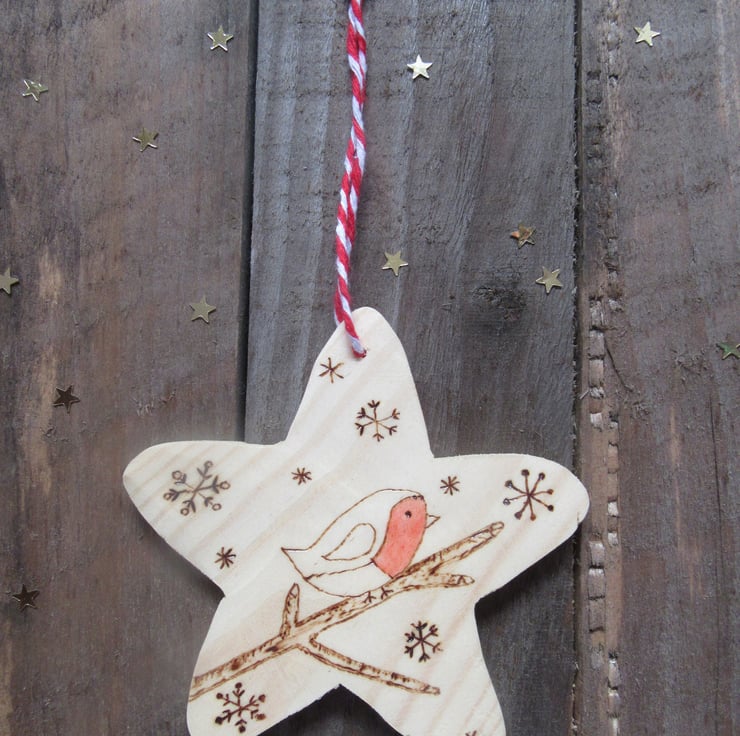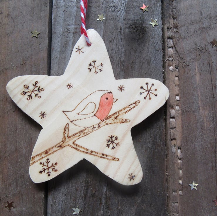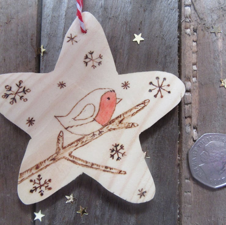 Each star is hand cut from left over pieces of wood. A robin and snowflake design is burnt into the wood and a touch of colour is added. And a protective layer of varnish gives a satin finish. It can be hung using the red/white cord.