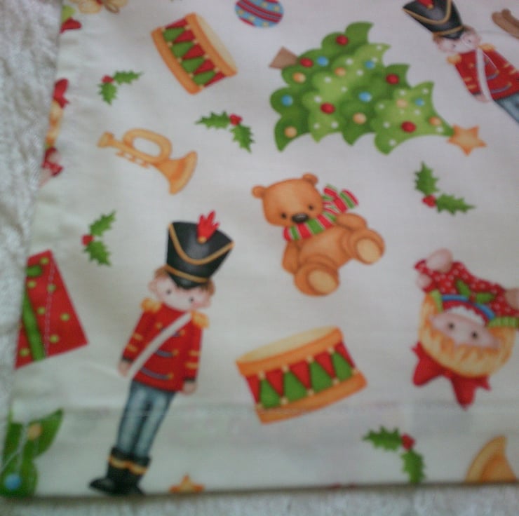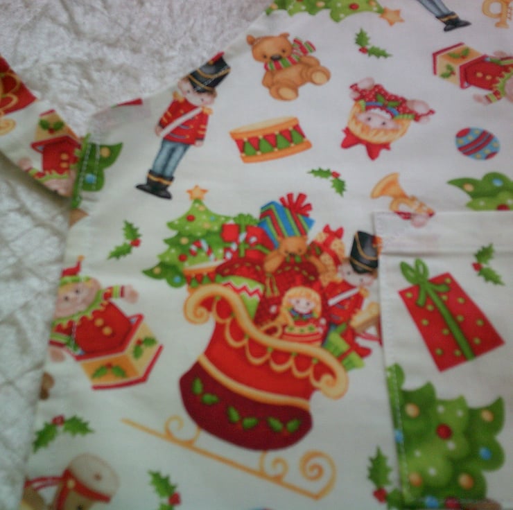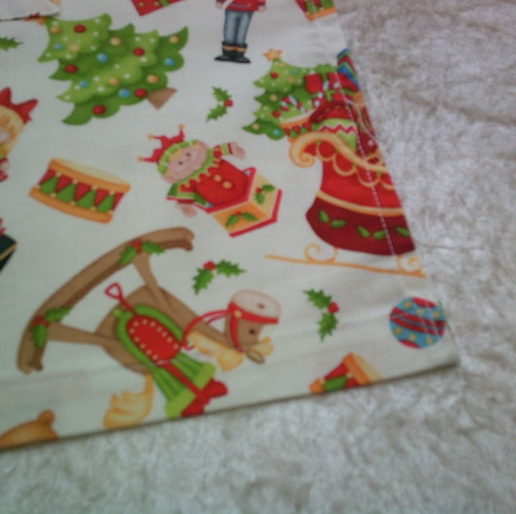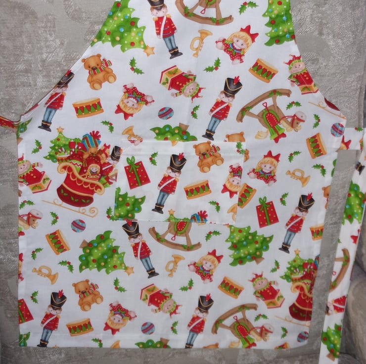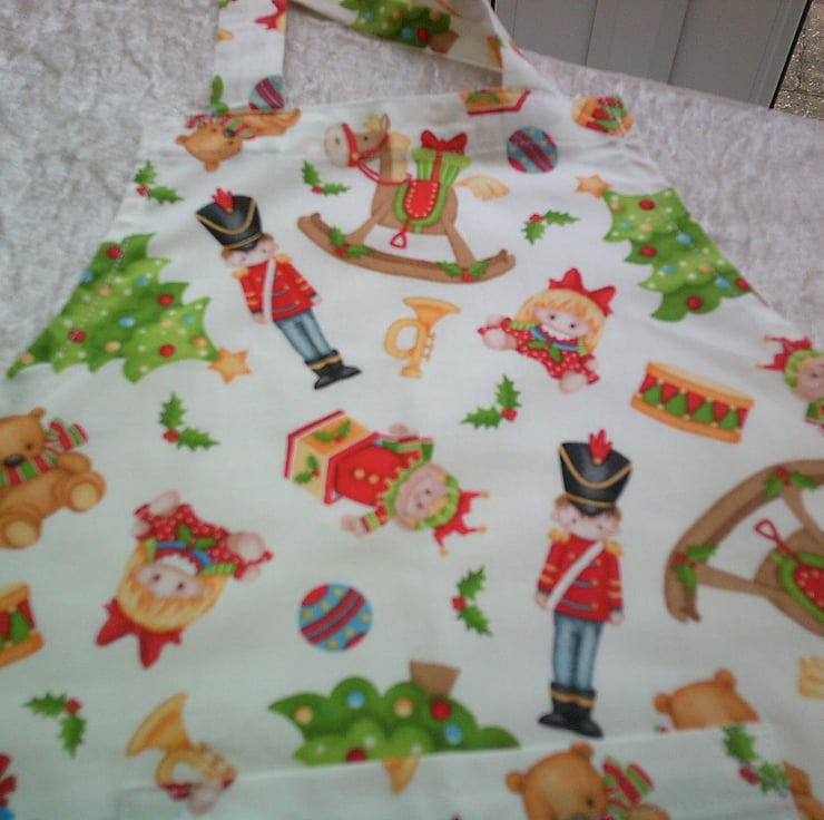 The design on this apron is Toys and Christmas Trees on a cream background.