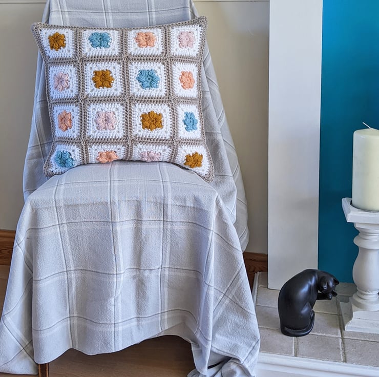 This little puff flower granny square was a design I hadn't tried before. I loved this combination of colours together and wanted a pretty cushion cover that would suit many different colour schemes.