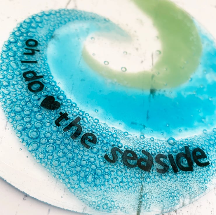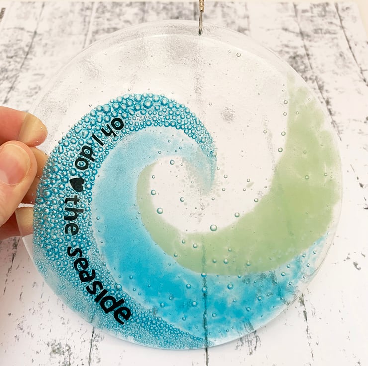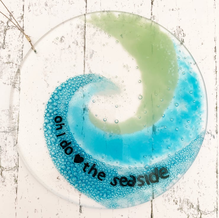 I hand cut art glass into 2 circles and use specialist paints and powdered glass to create my wave design. I then add the hand cut copperfoil letters which turn to a dark brown/black colour in the kiln. I then fuse it overnight slowly in my kiln. In the heat of the kiln, the specialist paint changes into hundreds of tiny turquoise bubbles.