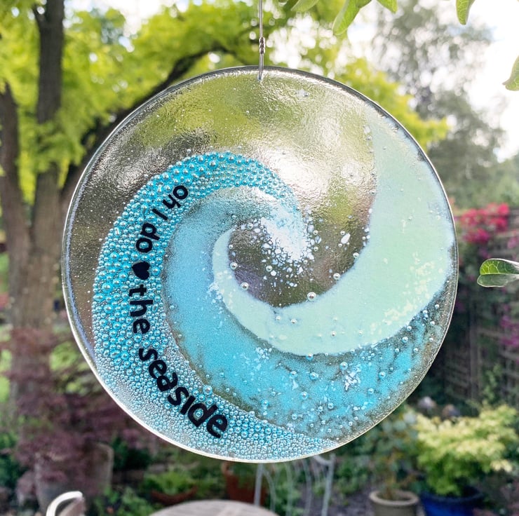 Fused glass hanging suncatcher, inspired by my awe of the pure energy and colours of the sea. I've included hand cut copper foil words which say "oh I do love the seaside." (The "love" is a little heart.) This suncatcher looks beautiful when hung in a window. A beautiful gift for a friend or relative who loves the ocean and perhaps dreams of having a seaview from their window.