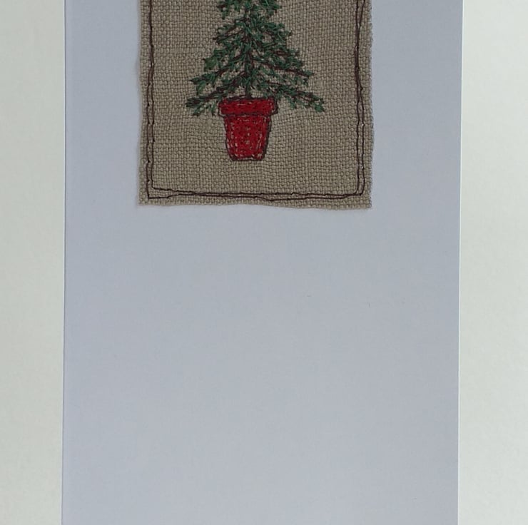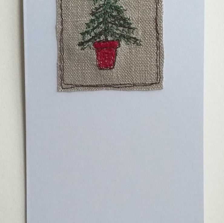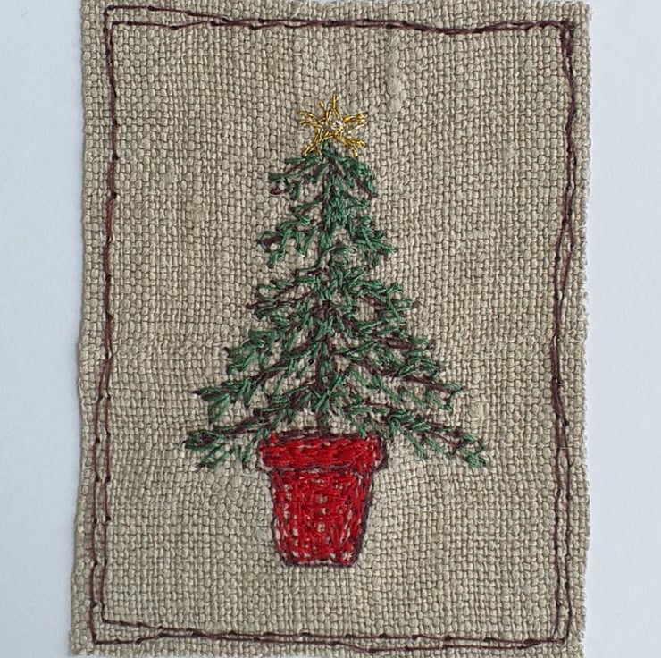 This beautiful card features a Christmas tree in freestyle machine embroidery, using different coloured thread on beige linen, including a little star in gold thread.