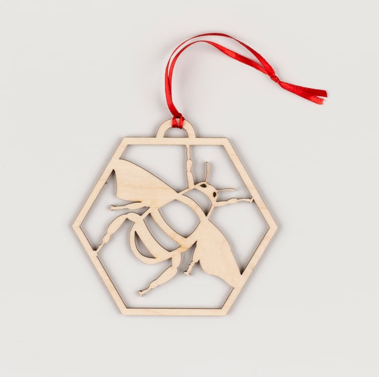 This wreath is designed by Beth from Boodle and laser cut in the UK. A bumble bee set in the shape of a honeycomb, perfect for bee lovers! , A perfect gift for Christmas. Comes with a thin red ribbon for hanging from a tree/fireplace/door or wall. The perfect plastic free decoration for your tree, made from FSC birch ply wood and laser cut in the UK.