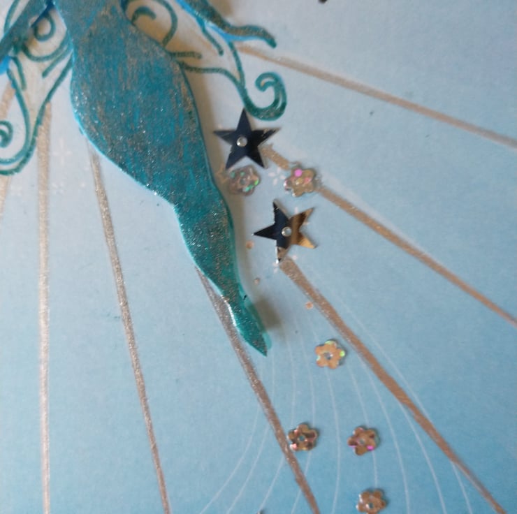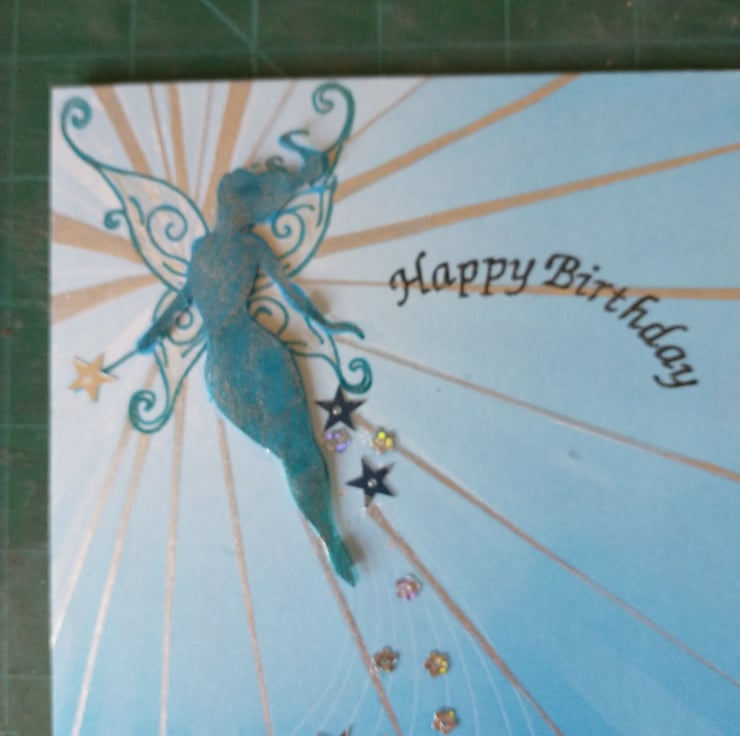 A completely handmade and uniquely designed card. Consisting of a beautiful fairy decoupage. Mounted on to co ordinating card. Embellished with stats and flowers. Finished off with happy birthday.