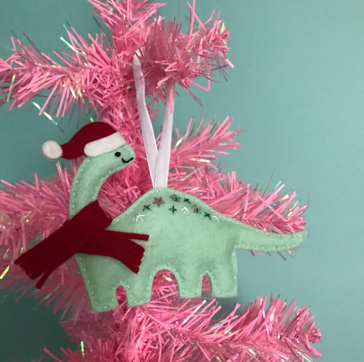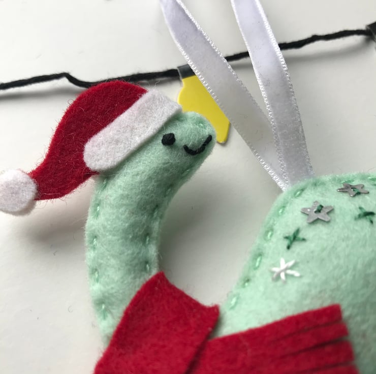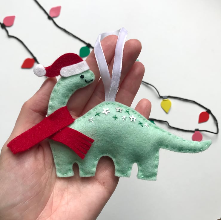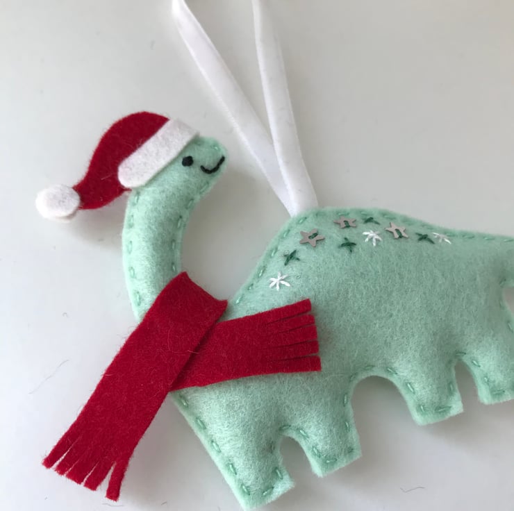 Made from 100% wool felt and completely hand stitched, the dinosaur is embellished with a sprinkling of embroidery and star sequins, a tiny Santa hat and a cozy red felt scarf.