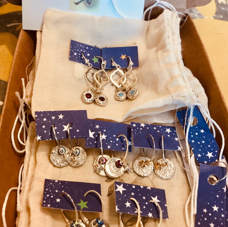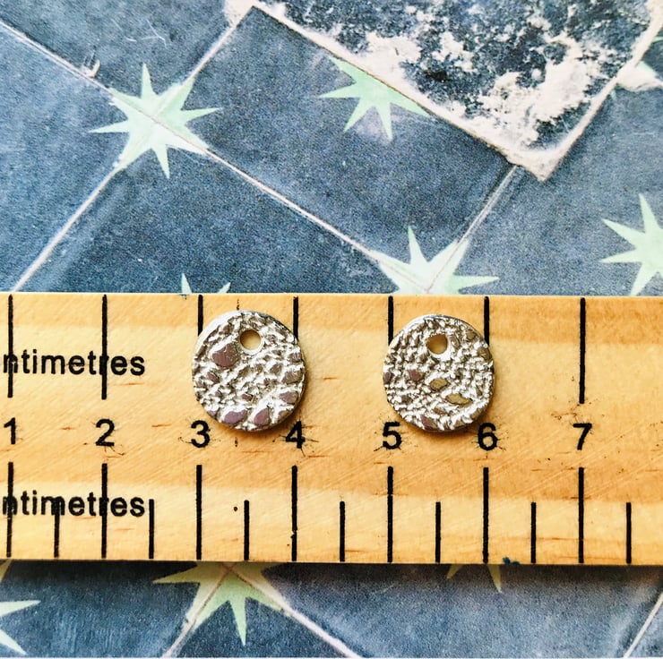 Each disc is individually rolled out by hand with a textured finish and measures approximately 1cm in diameter .Each pair of earrings is handmade and therefore may differ slightly from the photographs.