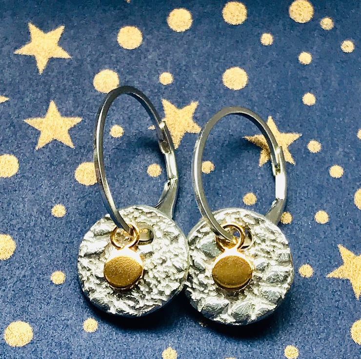 Mini solid silver discs set on a sterling silver lever back earrings with mini gold plated moon charms.