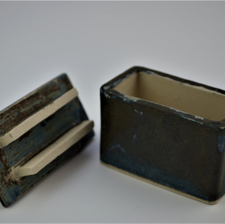 I make each box free hand not using molds or templates, so no two are alike and use an unpredictable glaze so each one has its own character.
