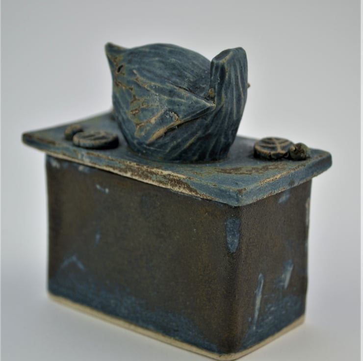 A ceramic lidded box with a modelled wren sitting on top. It was constructed with slabs, the wren hand modelled and carved to add details. Fired to stoneware temperatures and using a glaze that has an unpredictable nature, so each one is different.